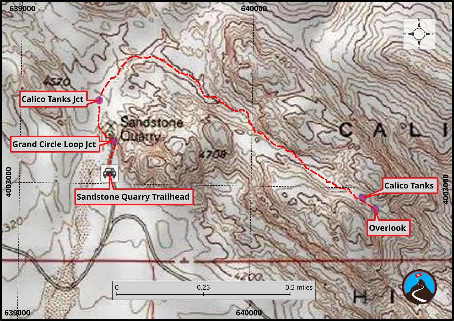 In less than 1/4 of a mile from the trailhead, the Sandstone Quarry is on the right. Stay on the main trail as it crosses the wash.