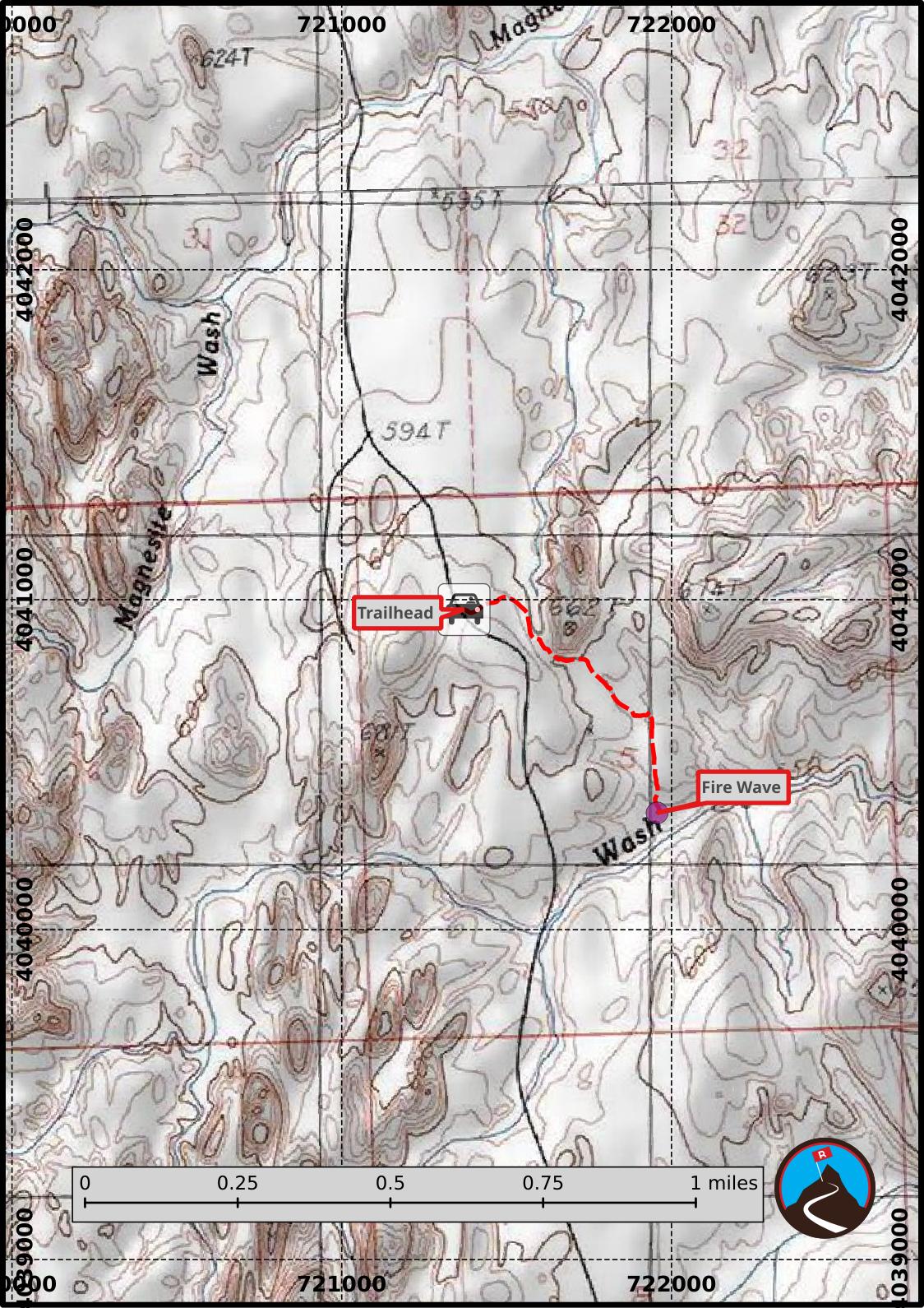 From the Visitor Center, go north on the Mouse's Tank Rd/White Domes Rd for 4.6 miles to a signed parking area on the right, and another parking area on the left side of the road. The parking area on the right is the trailhead.