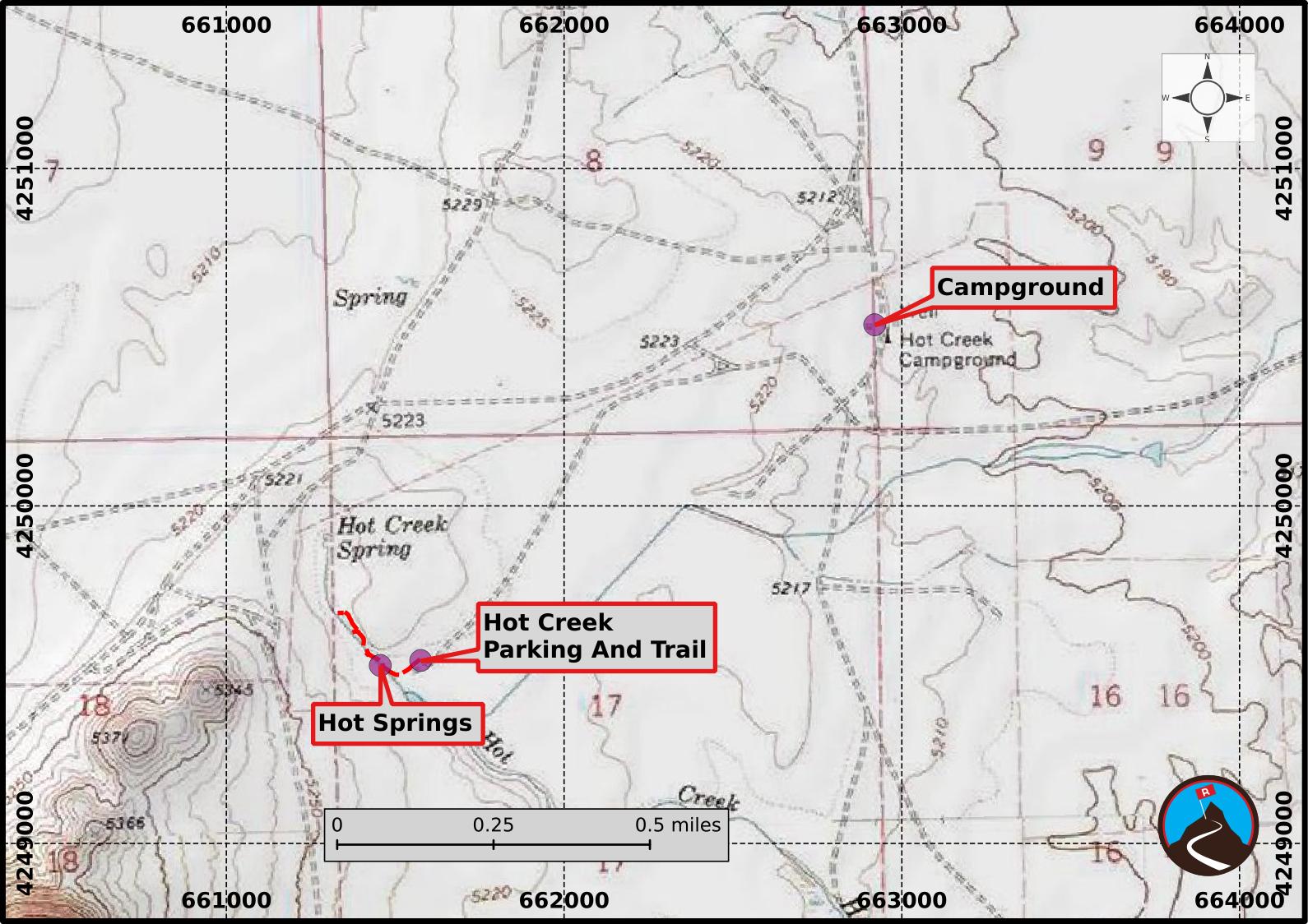 The turn-off to reach Hot Creek is at Nye County mile marker 20.9 on NV-318, the state route that connects Crystal Wash in the south to US-6 in the north. From Crystal Wash, this is about 60 miles north on NV-318. From Lund, it is about 32 miles south. The turn off is onto a graded dirt road signed for Dave Deacon Campground.