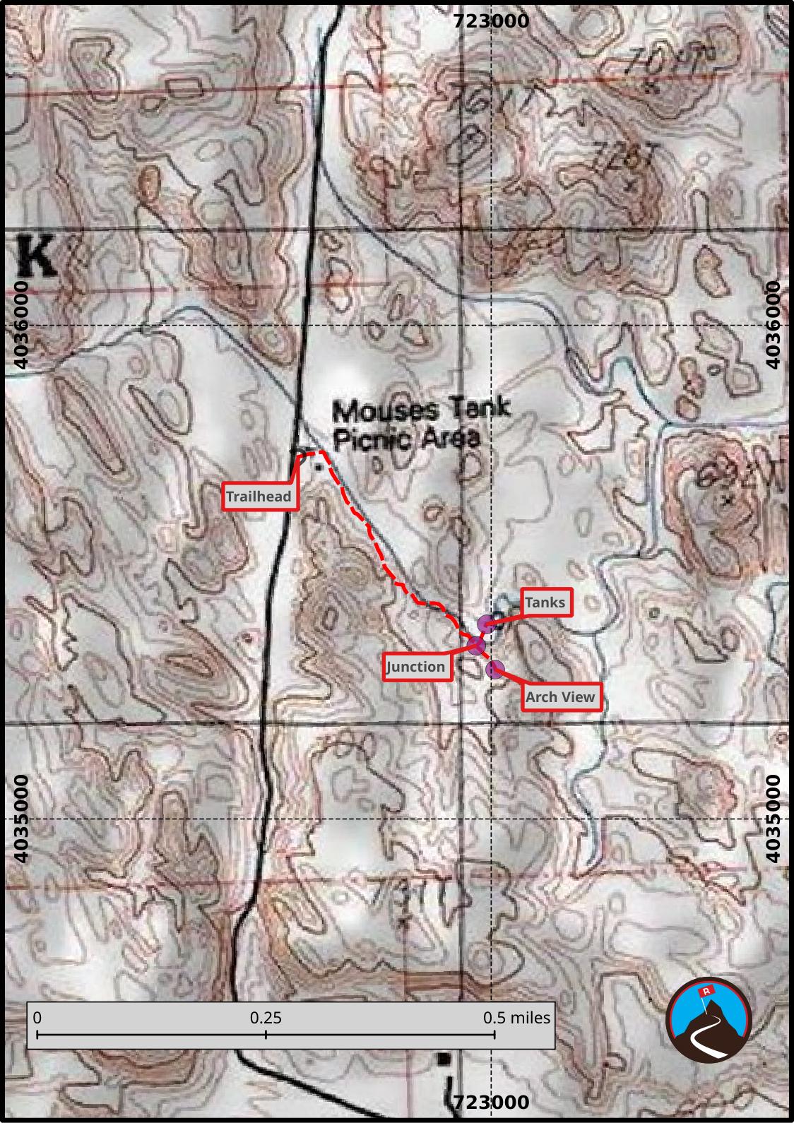 From the Visitor Center, go north on the Mouse's Tank Rd/White Domes Rd for 1.2 miles to a well signed parking area on the right, and another parking area/picnic are on the left side of the road. This is the trailhead.