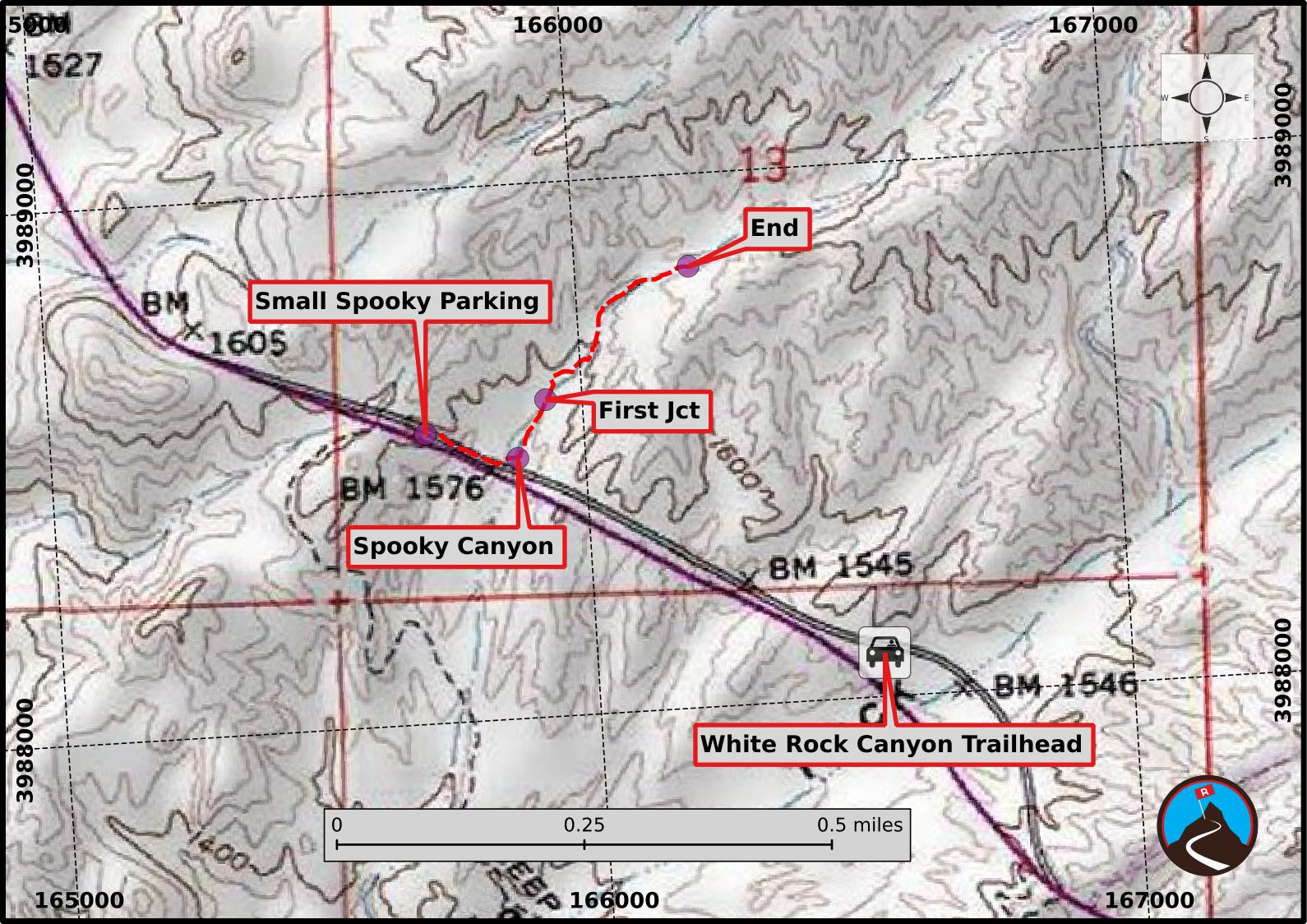 There are two options for the trailhead. The first, White Rock Canyon Trailhead, offers a good-sized paved parking area, and a restroom. If starting from this trailhead, it is about a half mile walk northbound along the highway to reach Spooky Canyon. The second is a small dirt pull-out right at Spooky Canyon. This offers a closer hike, but may be a little tricky getting on and off the highway. On a not-very-busy morning, we found the dirt parking area easy to get off and back on. Either way, the first step is to get to White Rock Canyon Trailhead.