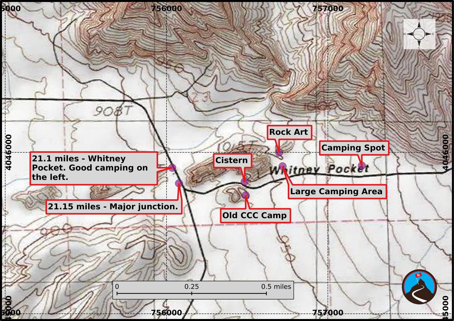 0.75 miles from the main junction is a final outcropping on the left (north) side of the road. There is a good camping spot here as well.
