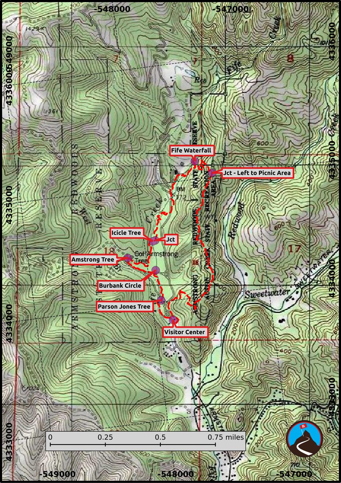 From Colonel Armstrong Redwood, follow the Discovery Trail back to the Pioneer Nature Trail, then right on the Pioneer Nature Trail back to the visitor center parking lot.