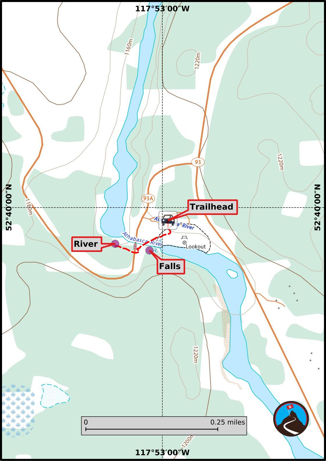 From the town of Jasper, go south on AB93 (Icefield Parkway) for 30 kilometers to the signed Athabasca Falls side road on the right. The road goes to a large parking area with restrooms.