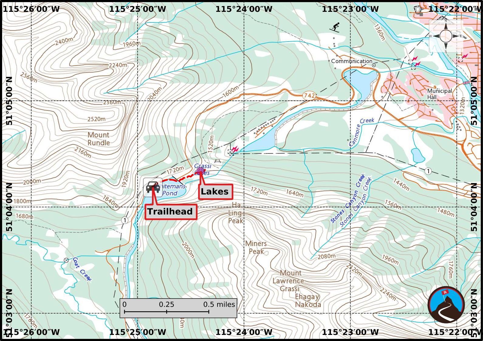 From Canmore, go south on Bridge Road, cross the Bow River, then the road becomes Rundle Drive. Continue on Rundle Drive 500m to Three Sisters Drive. Turn left on Three Sisters Drive. After 650m, stay right on Spray Lakes Rd/Three Sisters Pkwy/AB-742, and follow it an additional 6.3km to Whitemans Pond. There is a parking area on the left a hundred meters or so past the dam. This parking area is the trailhead.