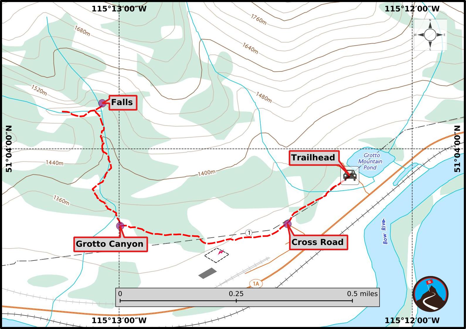 From the southeast side of Canmore, take Bow Valley Trail/AB-1A E for 10km. The trailhead is on the left, signed Grotto Pond.