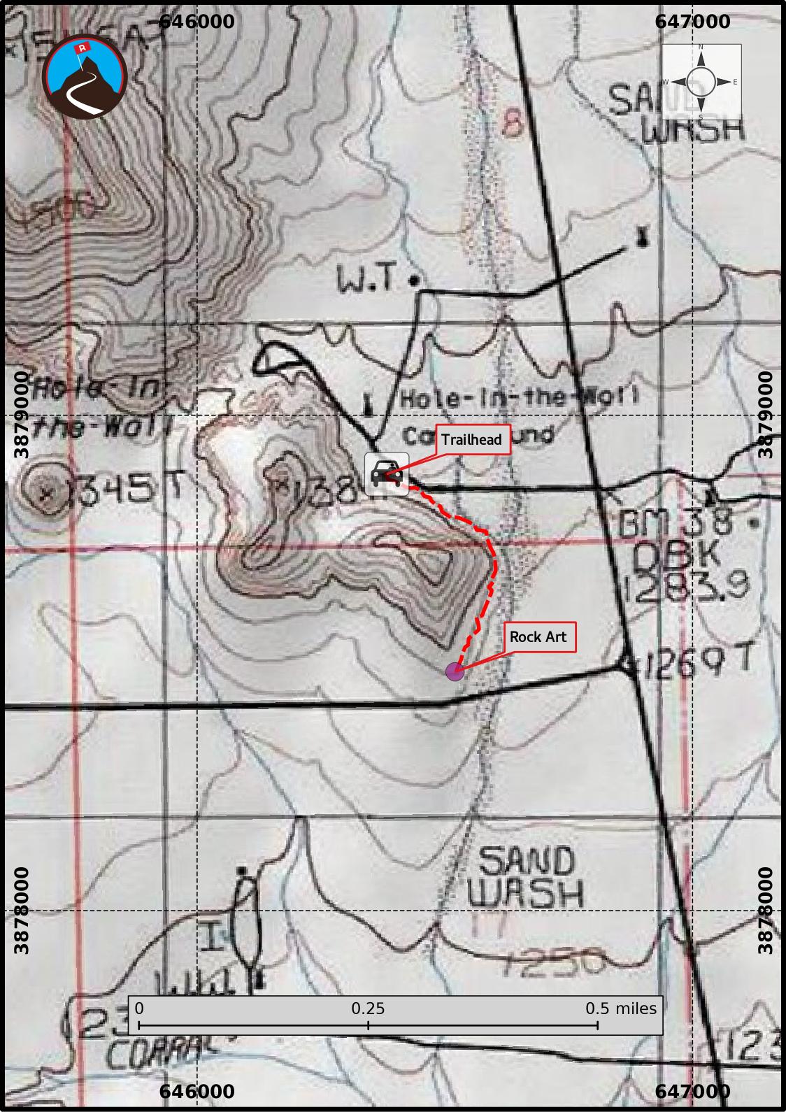 From the trailhead, follow the trail south. The trail is flat and stays near the bottom of the hill. A few minutes from the trailhead, where the trail begins to curve west, rock art is easily visible on the large boulders that line the trail.