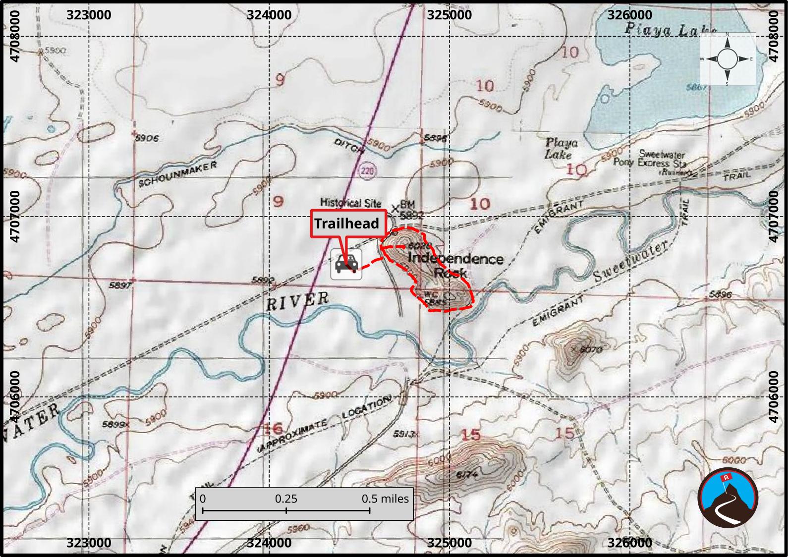 From Casper, head south on WY-220 toward Rawlins. About 58 miles from Casper, Independence Rock is on the left side of the road.
