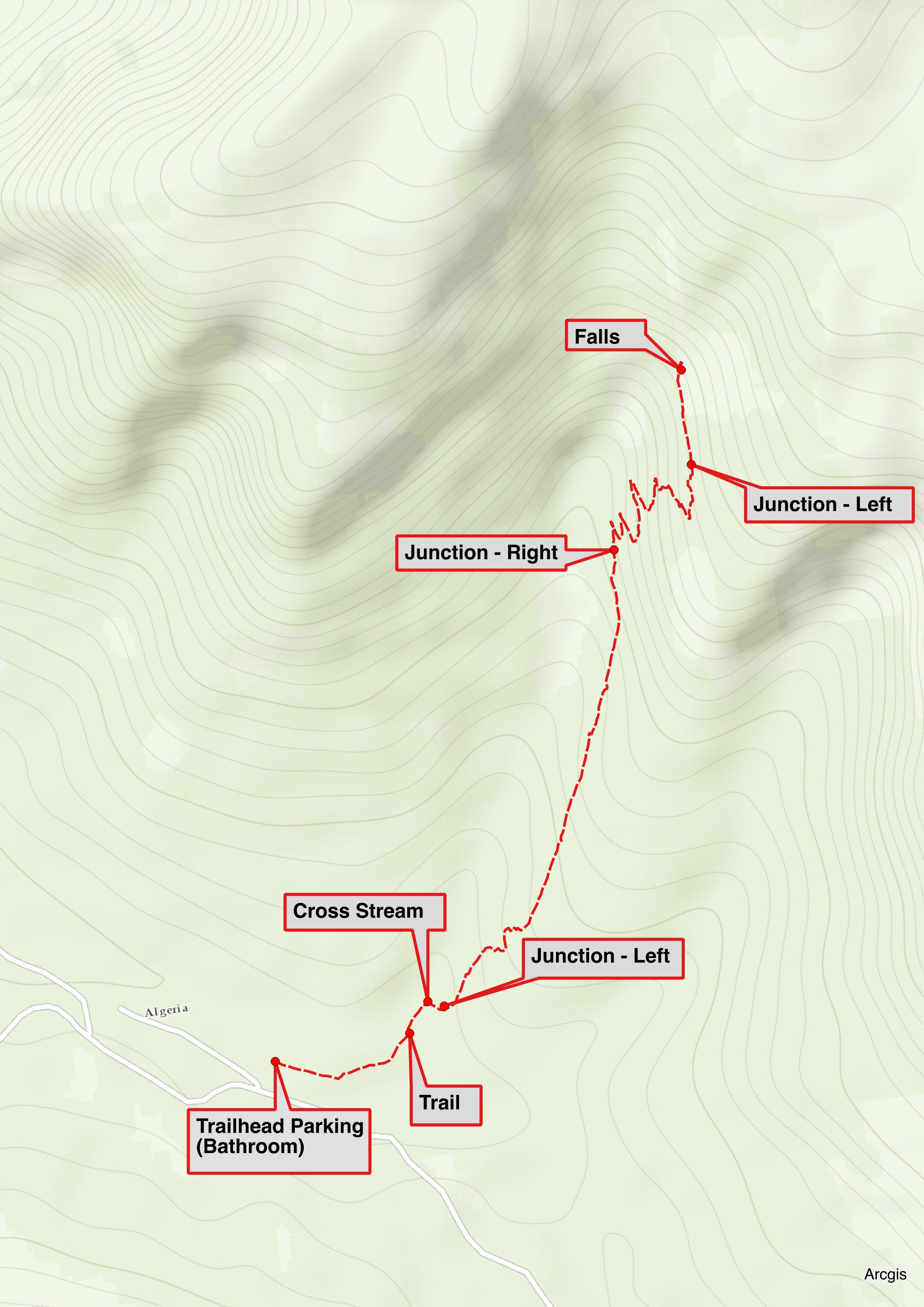 The trail begins a long gradual ascent up the hillside. About 30-40 minutes from the trailhead another junction is reached. Go right here. Left goes down to the stream. The trail begins a series of steep zig-zags before reaching a final signed junction. Go left a short distance down to the falls proper.