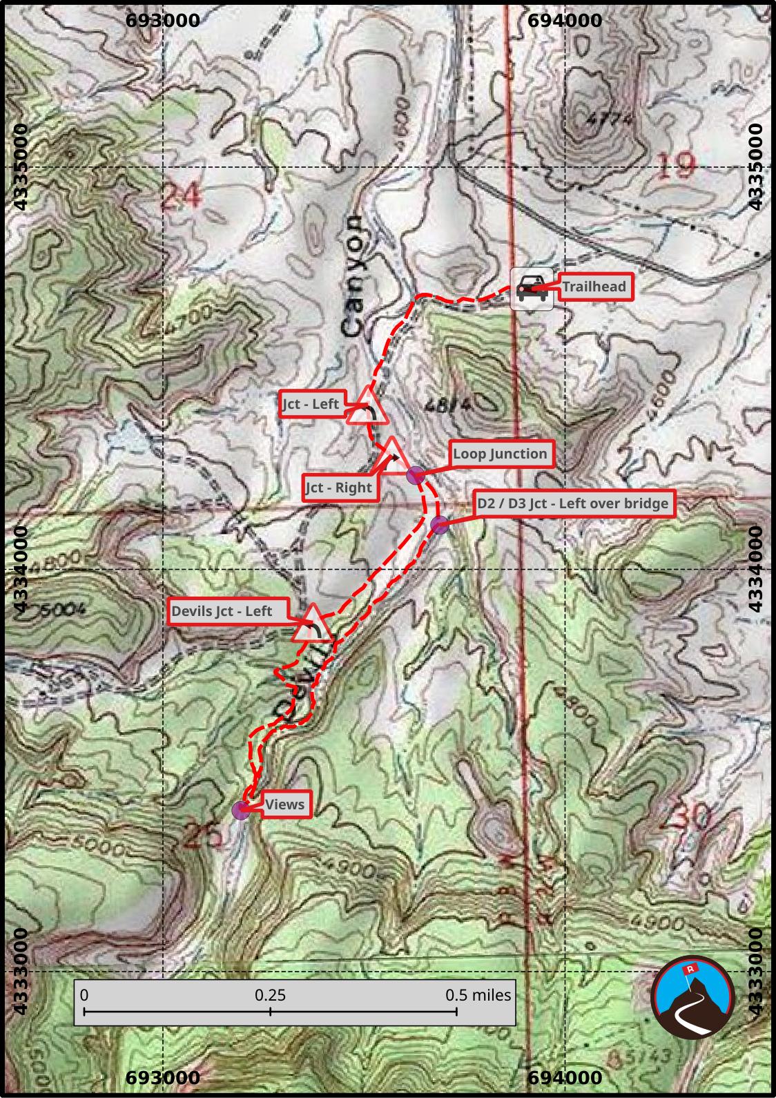 From the Devils/Kodel junction, go right. A photogenic tower is visible on the right, known as the Cowboy Hat. Not far after the Cowboy Hat is a trail junction. Go left here, leaving the road and switching to single track trail. The trail follows the rim of Devils Canyon, then descends to the canyon bottom.