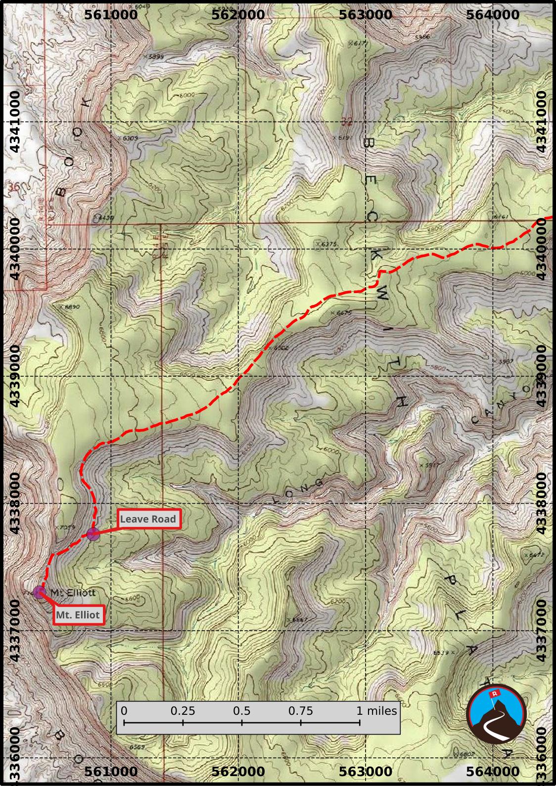 Once on the plateau, the steepness eases, and it is easy going, but deceptively long as the road meanders a bit en route to the rim. The road follows along the edge of Long Canyon in many spots, making for excellent views. Just over 2 miles from the top of the second switchbacks, the road descends a road cut and heads south. Once the saddle of Mt Elliot is above, leave the road. If driving, park where the road makes a hard left and starts heading east away from the peak.