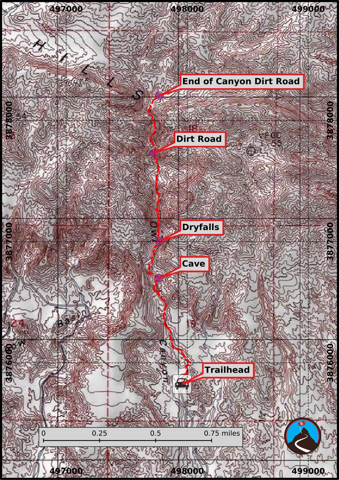 Beyond the dryfalls, the canyon opens into a wider brown canyon. This seems to be the turnaround spot for many groups, as the number of footprints above greatly diminished. If you continue, the brown canyon passes through a red layer before a final very colorful section of bluish greys and whites. I highly recommend this upper section; the colors are unique. In this upper section a side road comes in on the left, and the canyon opens and reaches a well-worn dirt road. Return the same way.