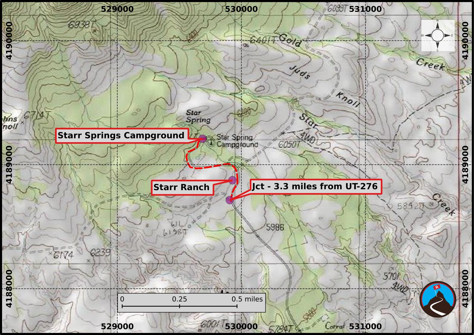 From Hanksville, head south on UT-95 for about 27 miles to the junction of UT-95 and UT-276. Go right on UT-276 toward Bullfrog/Ticaboo for 17.1 miles to a signed dirt road on the right that heads up into the Henry Mountains. The road is signed for Starr Spring.