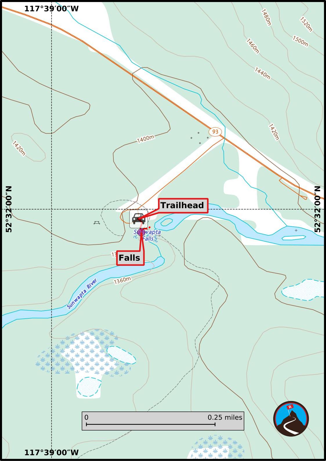 From the south side of Jasper, take AB-93 S for about 54 km. Sunwapta Falls is a signed road on the right at the Sunwapta Falls Lodge. Follow the side road 500 m to its end at the trailhead.