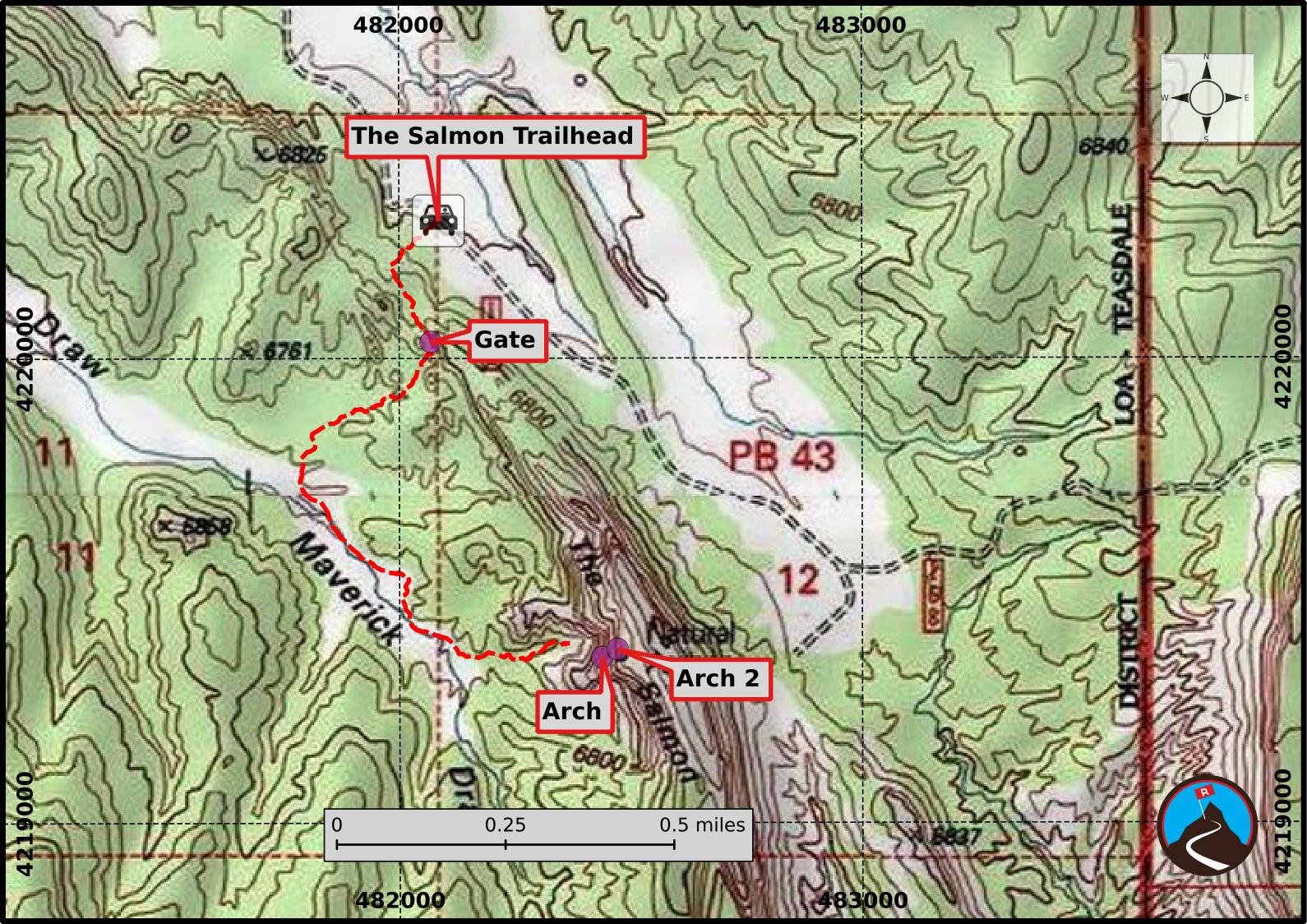 Follow Maverick Draw up stream. The large sandstone feature, The Salmon, is easily visible in the distance. As you get closer, look for the arches. The highest arch is most visible from a distance. The lower arch is easy to spot up the first major drainage that goes to The Salmon. Return the same way.