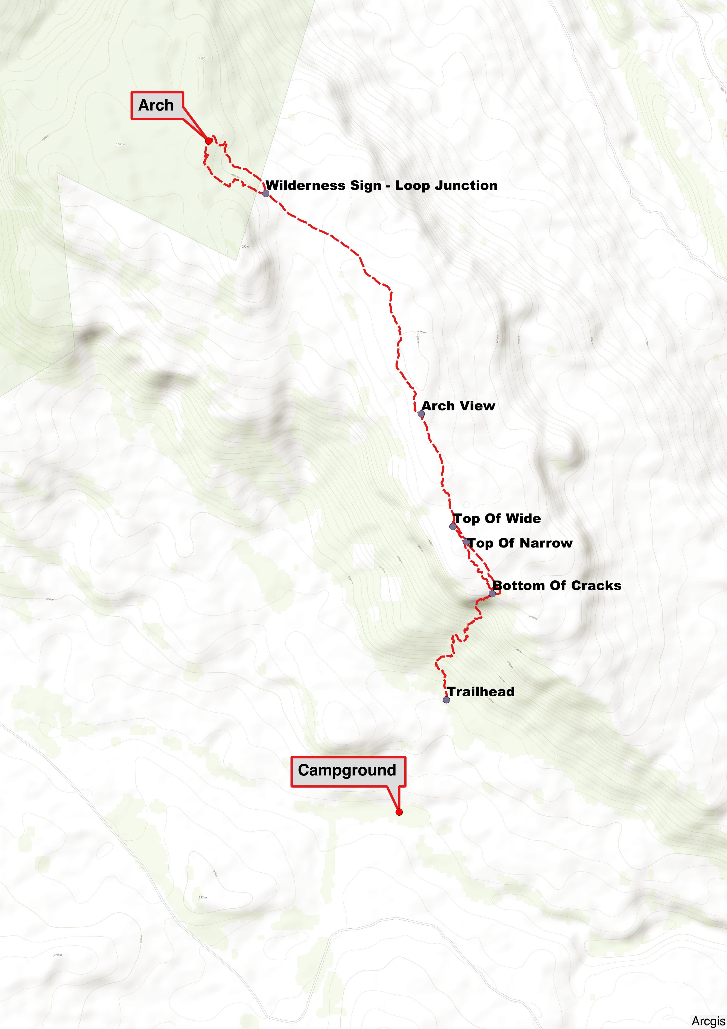 The trail is easy to follow in most places. When in doubt, look for cairns. Just below the arch, an old wilderness sign marks a junction. The trail splits. Go left, and the trail meanders up to the arch. On return, you can circle back down to this junction.