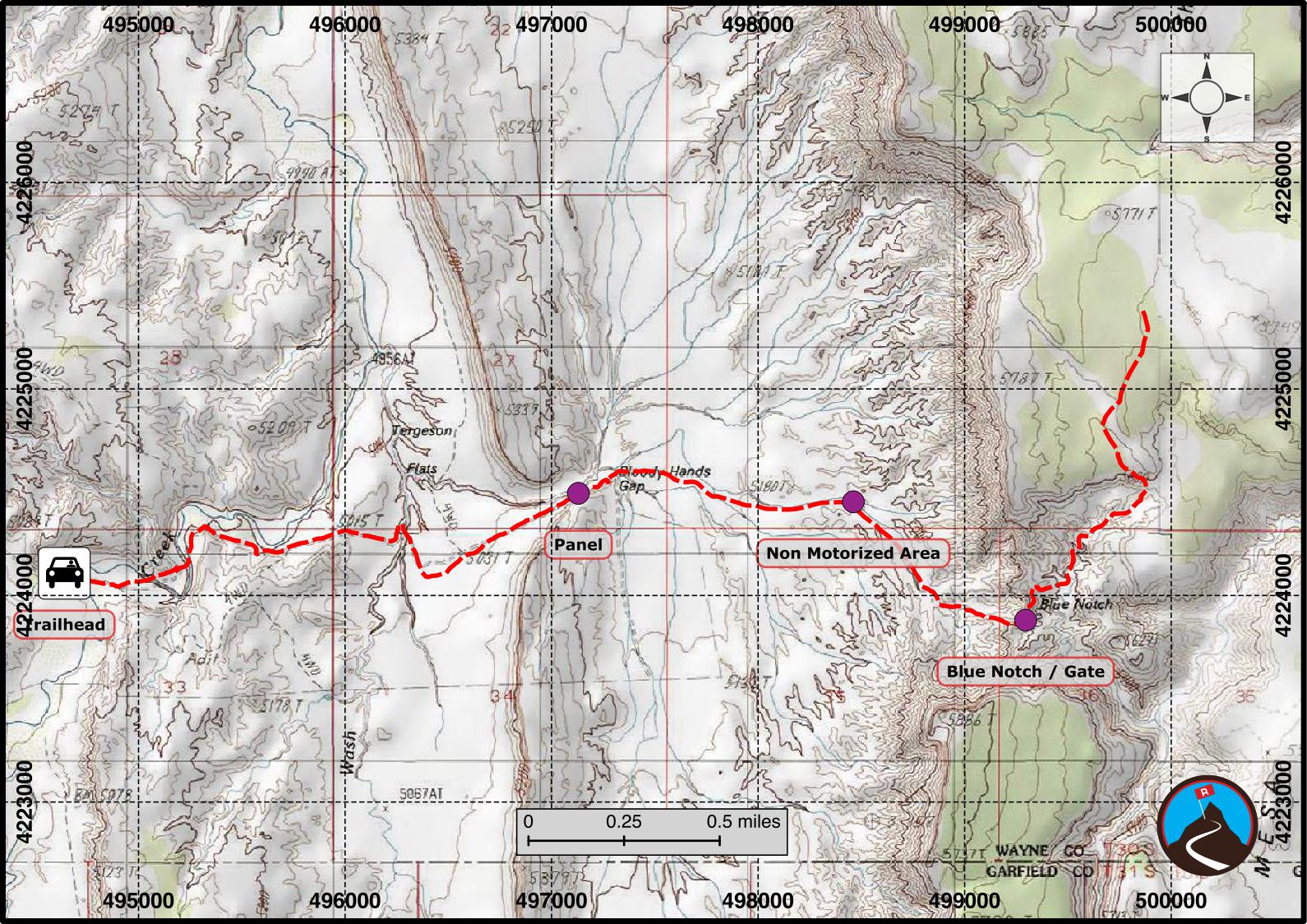 Got more energy? Bloody Hand Gap is on the western side of a barren moon-like landscape that is very different than its neighbor Capitol Reef National Park. I would recommend continuing either to Blue Notch, or all the way to Thompson Mesa on a historic stock trail. The mesa overlooks the higher elevations of the Blue Hills Wilderness Study Area to its east, and the badland are just passed through to the west. The badlands of the WSA were described by one visitor as "ever so much badder than Badlands National Monument" (Hunt, 1980) That part of the WSA is not visible from the mesa, but the area to the west that is crossed to reach the mesa top is identical in stark beauty.
