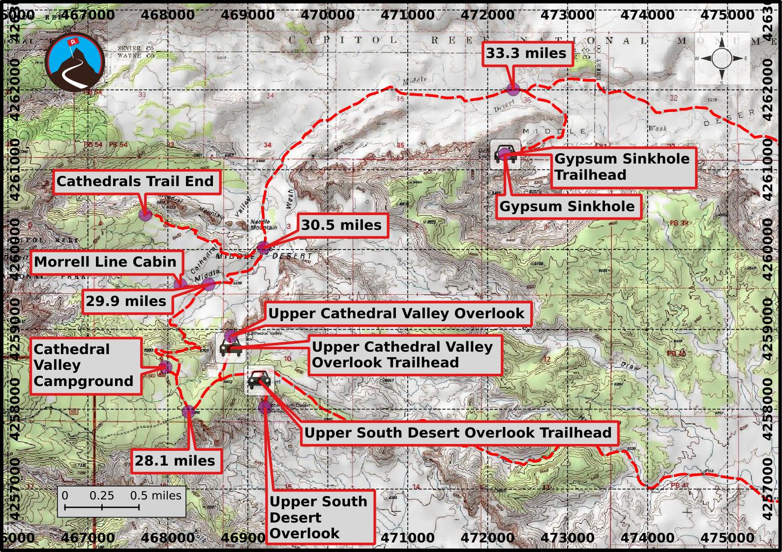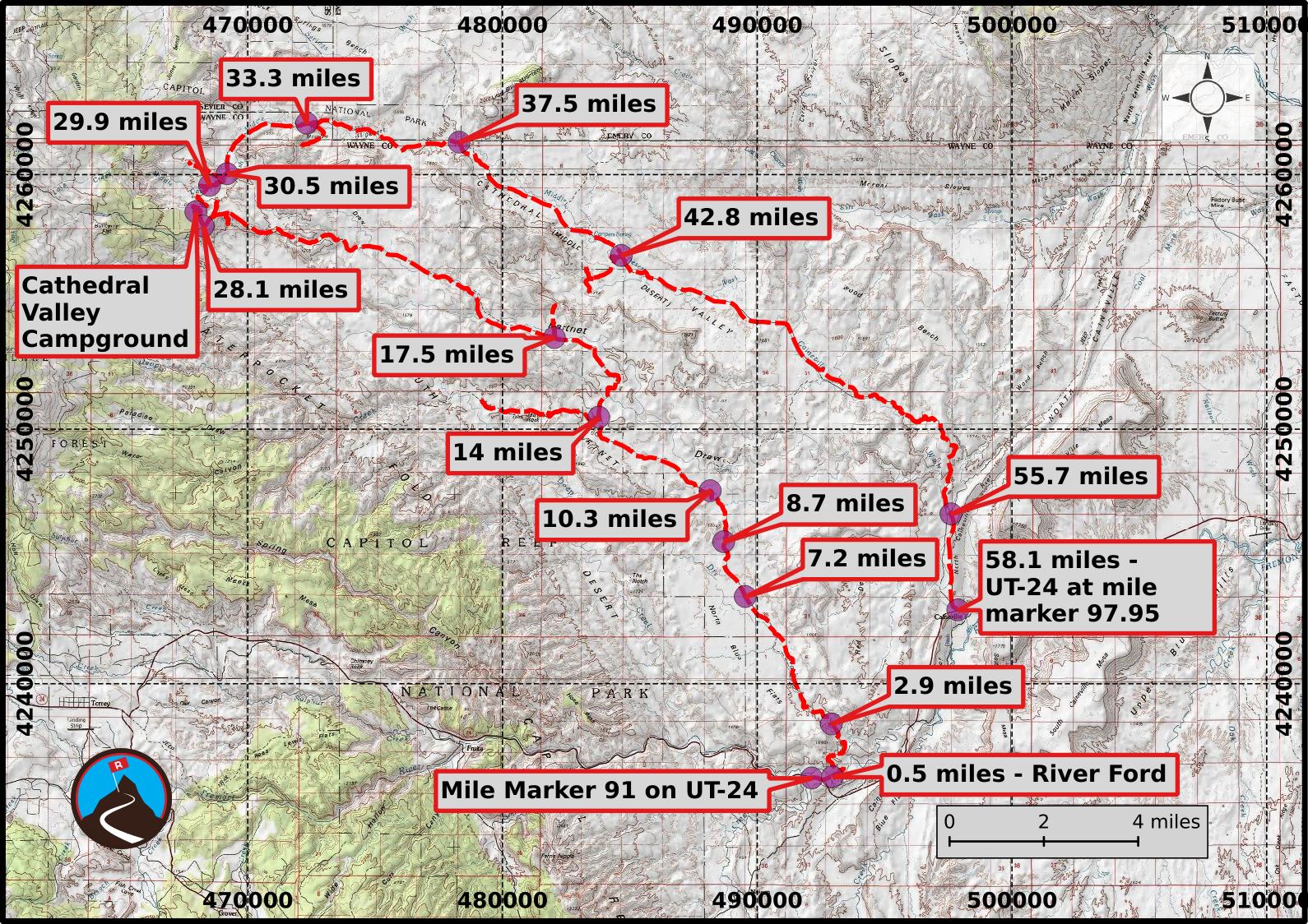The route requires crossing the Fremont River. This crossing is usually fairly straightforward, but can be impossible during spring runoff or after recent rains. Call the park's automated phone system at (435) 425-3791 and press 1 for visitor information; 4 for road conditions. This is updated regularly with information and depth of the ford. The USGS also maintains a stream guage near the ford ( https://waterdata.usgs.gov/monitoring-location/09330230/#parameterCode=00060&period=P7D&showMedian=true ). I recommend less than 50 CFS on the guage for easy crossing though you can go a fair bit higher in high clearance vehicles.