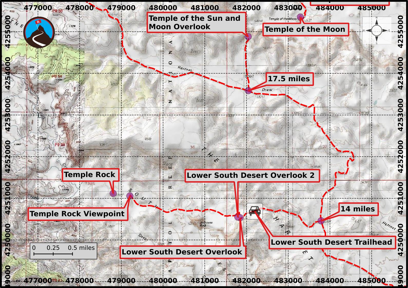 The Lower South Desert Overlook side road leaves at mile 14. This side road, about 1.1 miles each way, ends at a stunning overlook into the Lower South Desert. Those looking for a hike can walk an old road from the parking area west to even better views, then descend into the Lower South Desert proper. (less than 1 mile round-trip depending on how far you hike) It is a nice hike, and highly recommended. If you have time, you can continue along a social trail/faded mining track west along to the photogenic Temple Rock. This makes for about a 4.6 mile round-trip hike.