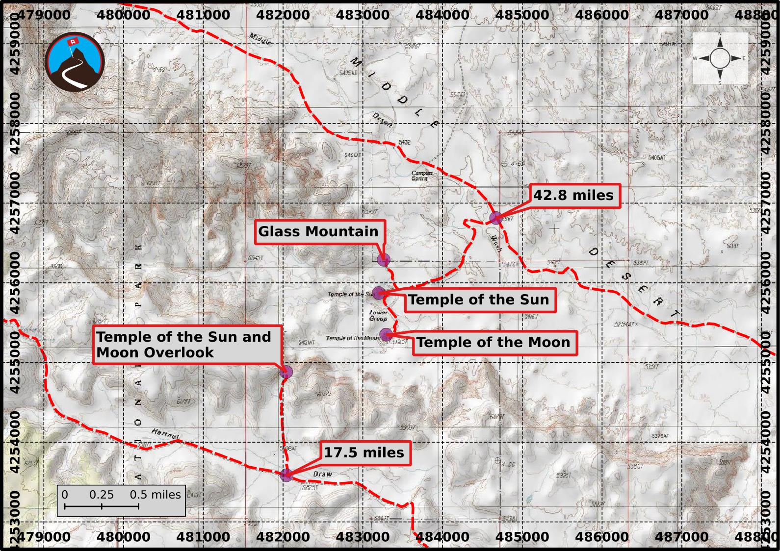 My favorite stop of the drive! At mile 42.8 is the side road to Temple of the Sun, Temple of the Moon, and Glass Mountain. Follow the side road about 2 miles (one way) to visit these features. Glass Mountain is north of the temples, with a signed side road visiting it. This is my favorite stop to get out and walk around one or both of the temples. This is also the last stop on the drive.