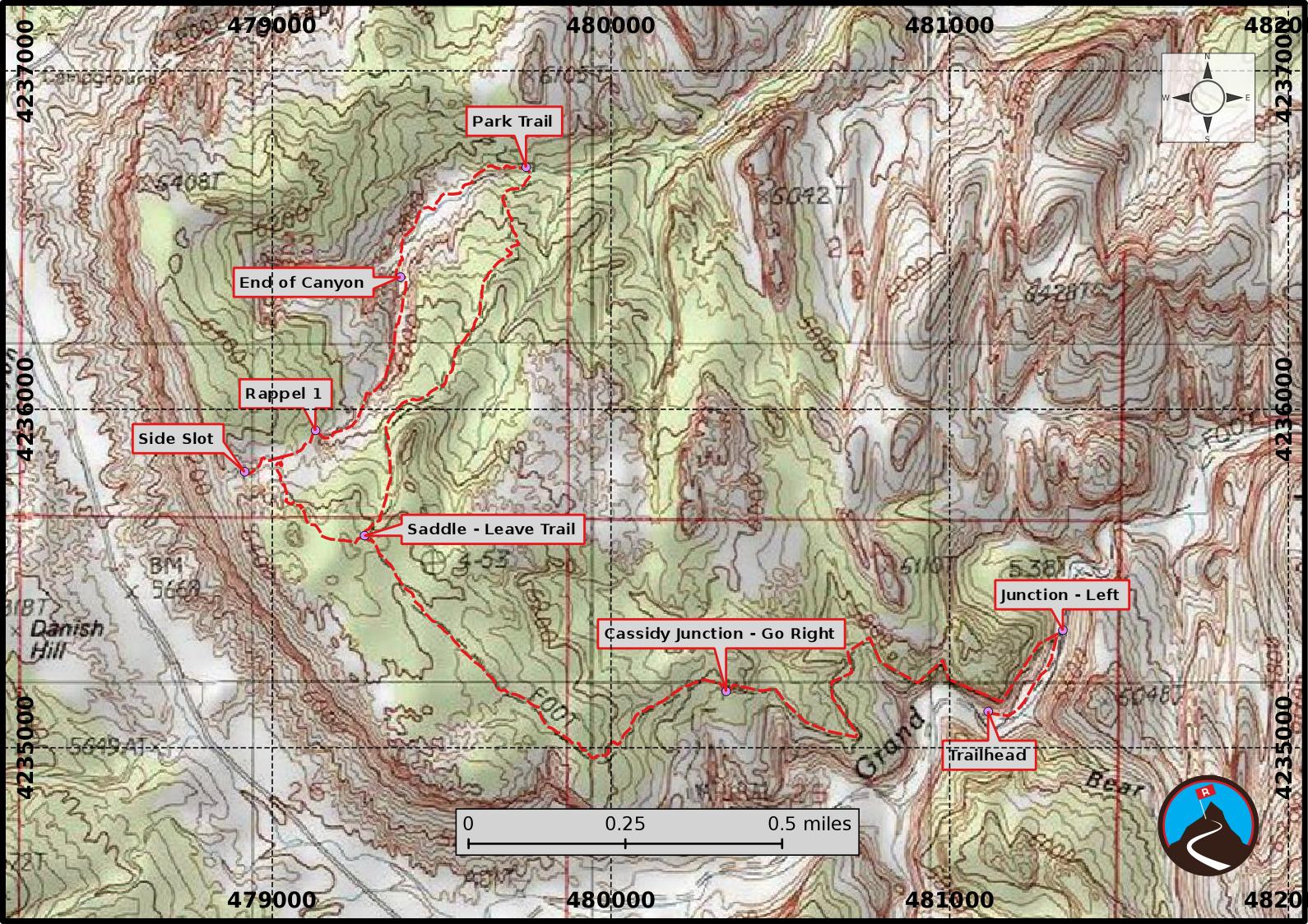 Most of the canyon is an easy and straightforward amble. The crux section, however, requires a few downclimbs that are a bit exposed, and a bit hard! Every group needs a solid climber! Anchors aren't easily available at two of the crux drops.