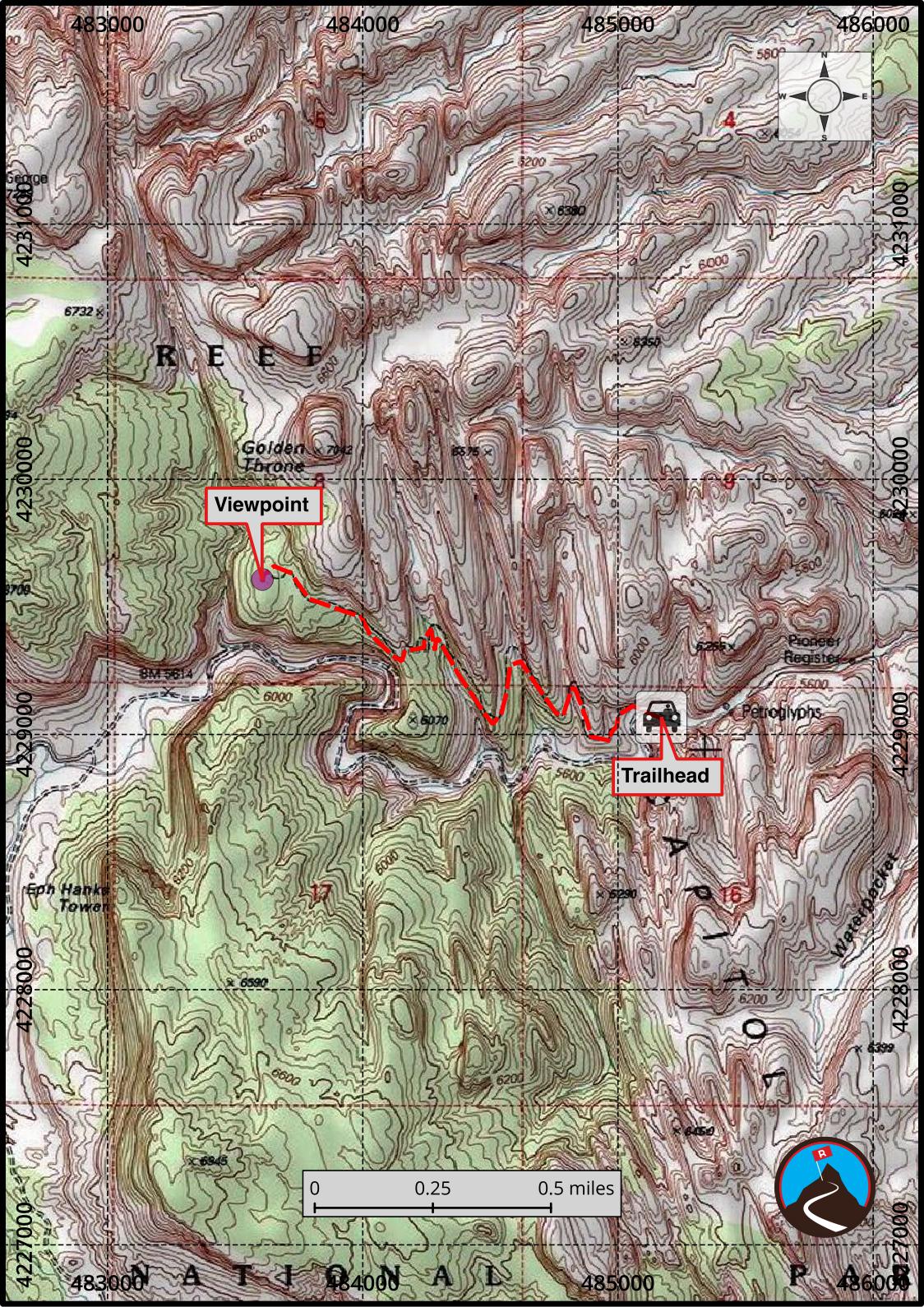 Visible from many areas of the park, the Golden Throne hike is a good hike for getting out of the canyon bottoms and seeing the big scenery the park offers. This hike offers very little shade, don't attempt it in the full heat of a summer afternoon. Though it gains a fair bit of elevation (220 m ( 722 ft. )), it feels fairly gradual.
