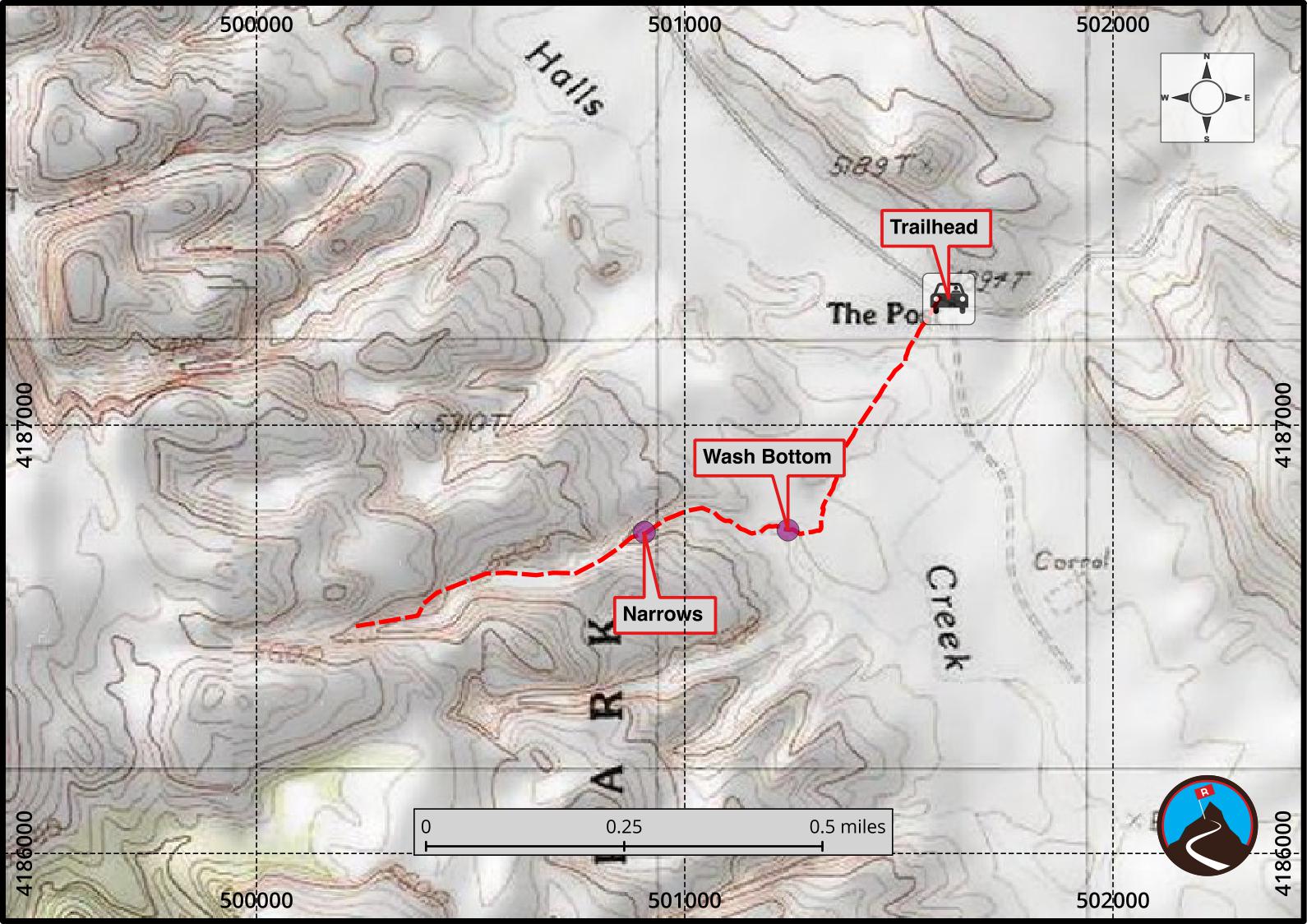 From the small parking area, head west on the trail toward the reef. Headquarters Canyon is the pink striped canyon visible almost due west of the trailhead. The trail crosses the valley bottom to the base of the sandstone dome, then cuts slightly south over a low ridge and down to the wash bottom.