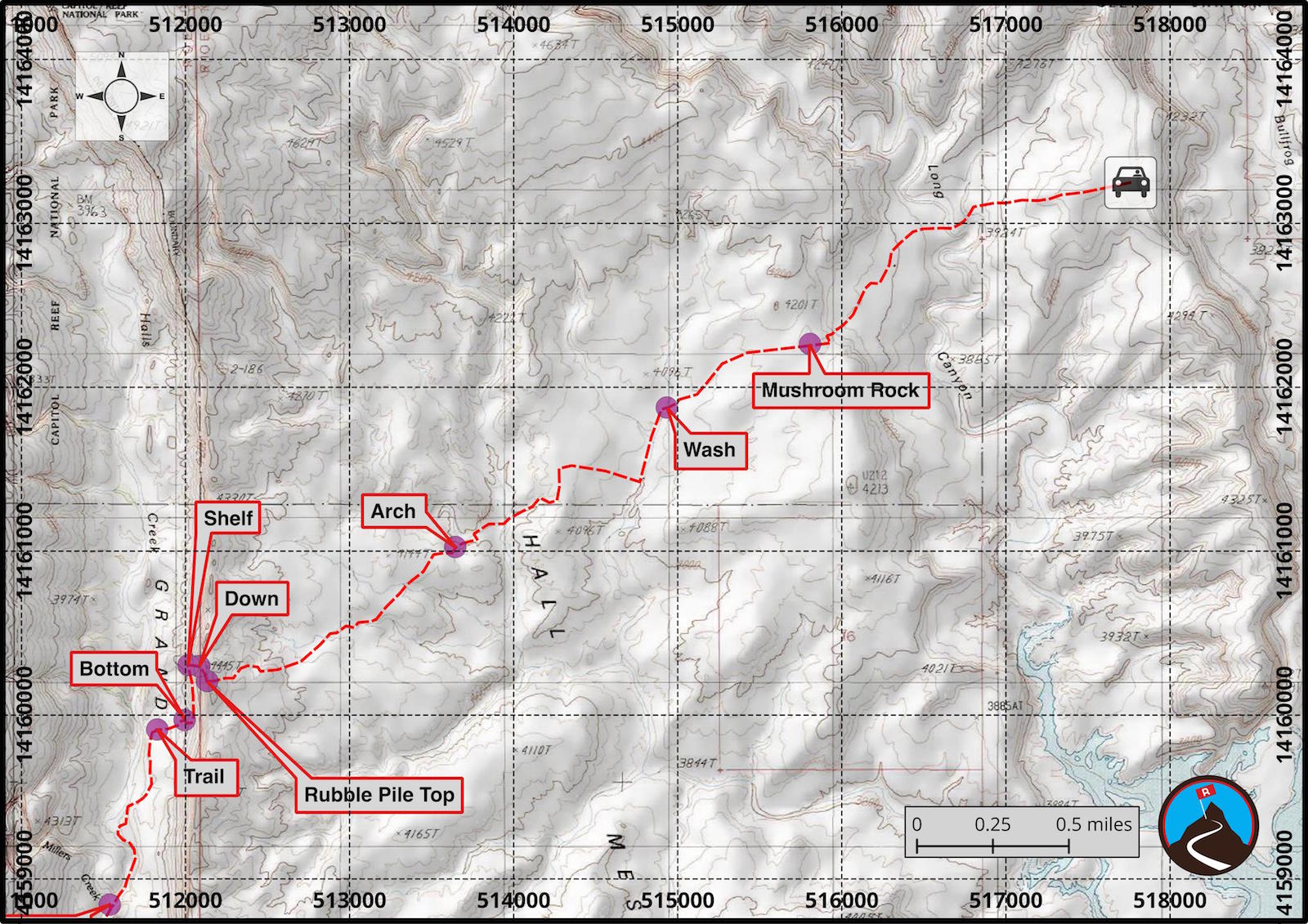 The route from the Burr Trail road is about 5 miles to Halls Creek. En route, there isn't much shade, and the terrain is difficult to navigate. GPS or excellent map and compass skills required to find the top of the Rubble Pile. Though only 5 miles, expect 3-5 hours for the approach/exit. In full heat of the summer, our group suffered mightily! Start early if it's hot!