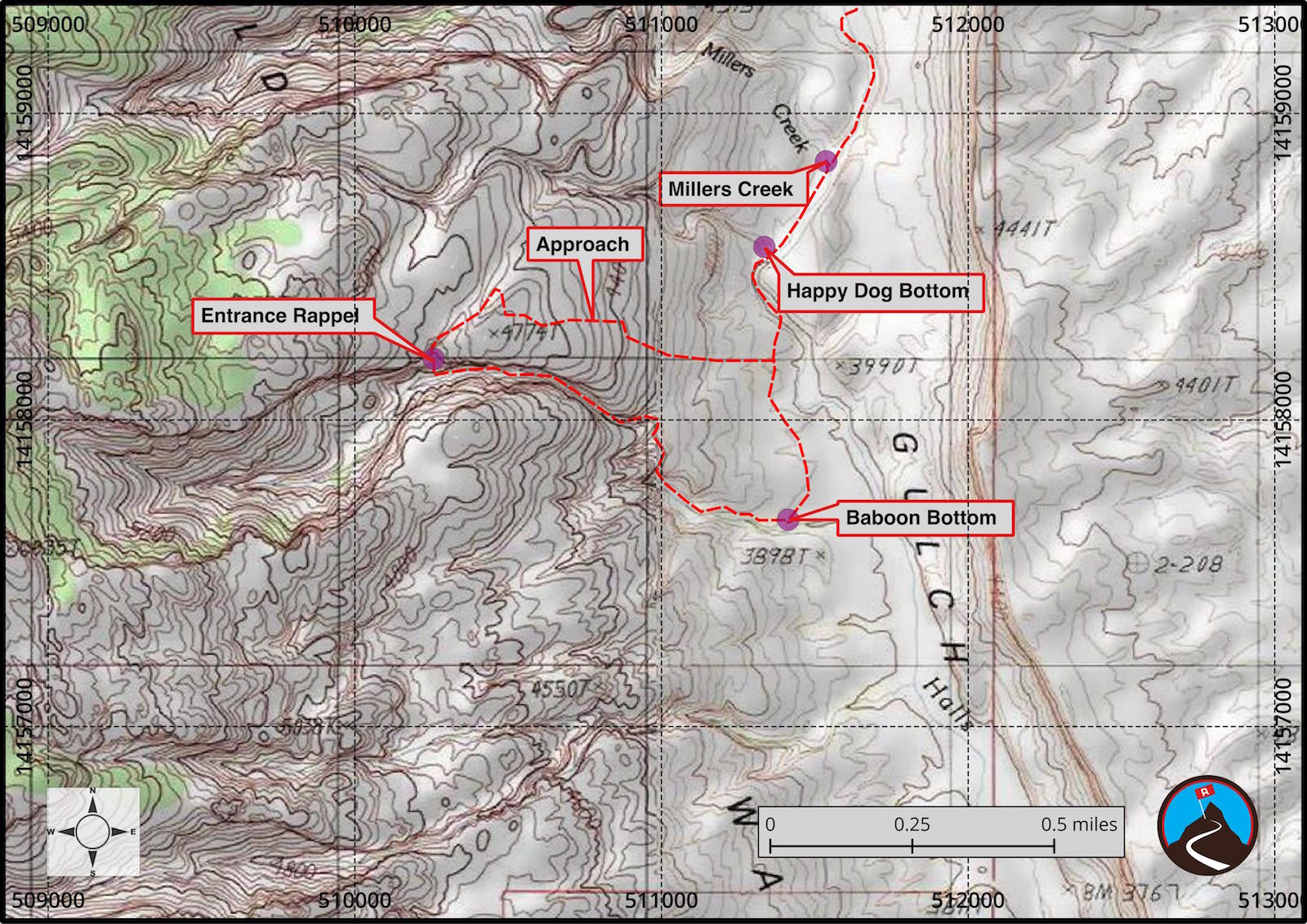 From Millers Creek, hike down Halls Creek 10-15 minutes past Happy Dog. Just before Halls Creek cuts through a layer of sandstone, work west and up the sandstone slab. Trend left (south) as you ascend the slab. There are many options. At the high point, Laughing Baboon is on the left (south). A minute or two west a side drainage dumps into Laughing Baboon. Work down the right side of this drainage (looking down the drainage.) A bit of easy scrambling and loose dirt reach a bowl and the first rappel.