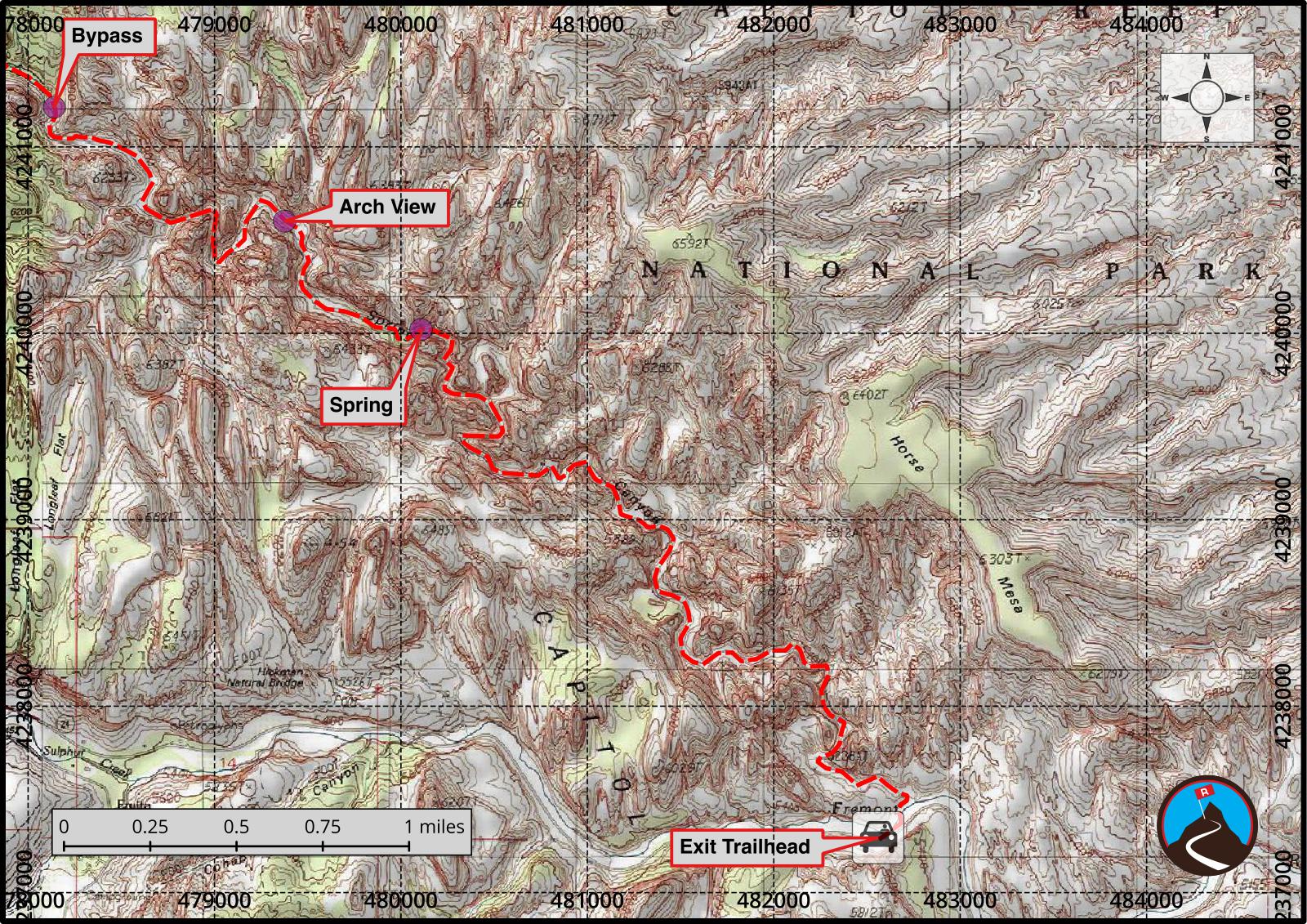 This hike requires a car shuttle and crossing the Fremont River at the end of the day. Normally the river is less than knee deep, but it can be difficult/dangerous to cross for a few weeks during spring run-off or after very heavy rains. It is prudent to eyeball the river before setting out. It would be a harsh surprise to hike the 11 miles only to find the river too dangerous to cross.