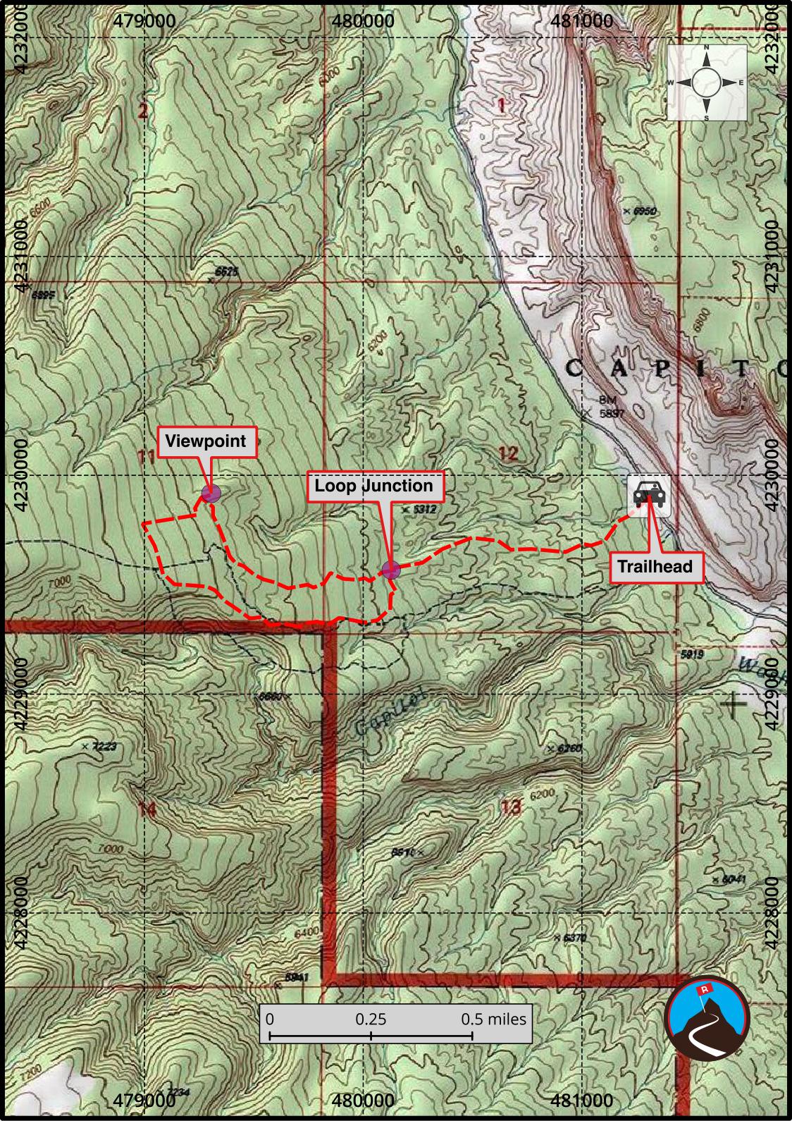 From the Capitol Reef Visitor Center, follow the Scenic Byway. At about 1.6 miles is the pay booth. At 6.5 miles, a pullout on the right side of the road is the Old Wagon Trail trailhead.