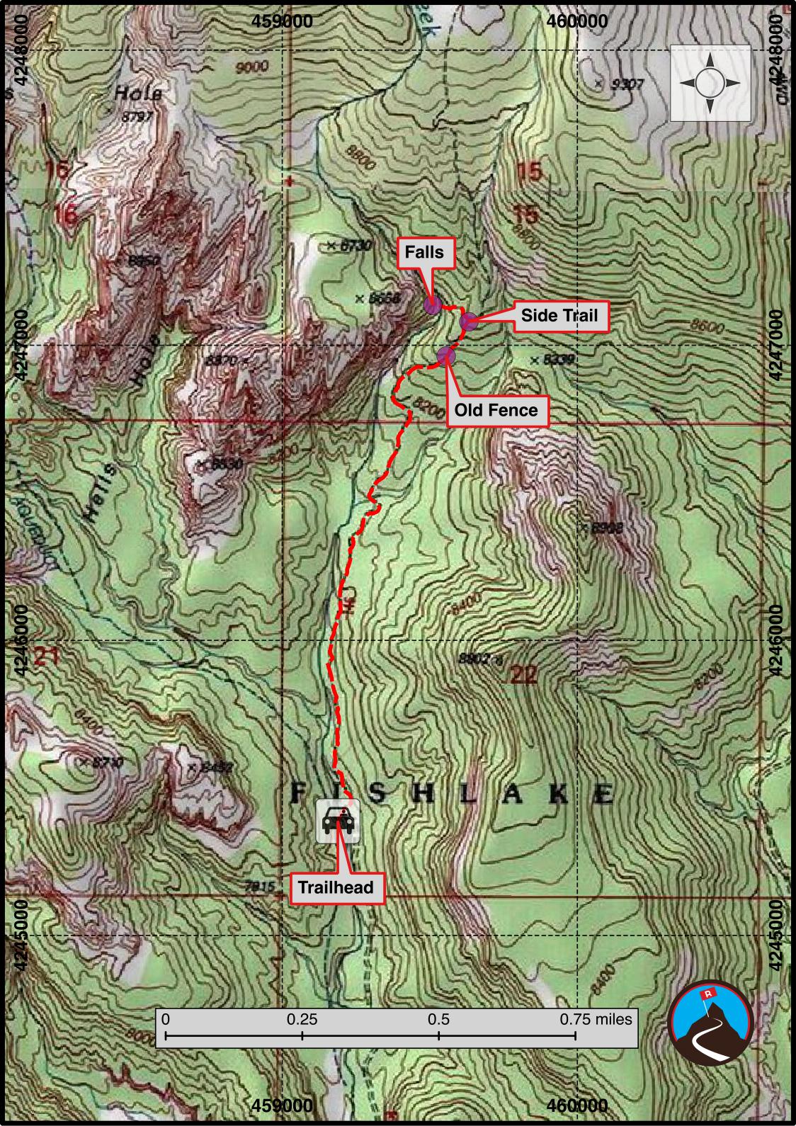 The trail steepens, and passes through an old fence at about 1.2 miles. This is an important landmark. About 0.1 miles past the fence (a few minutes) begin looking for a cairned side trail on the left. This is also the point you should be able to hear the falls and even catch a glimpse of them.