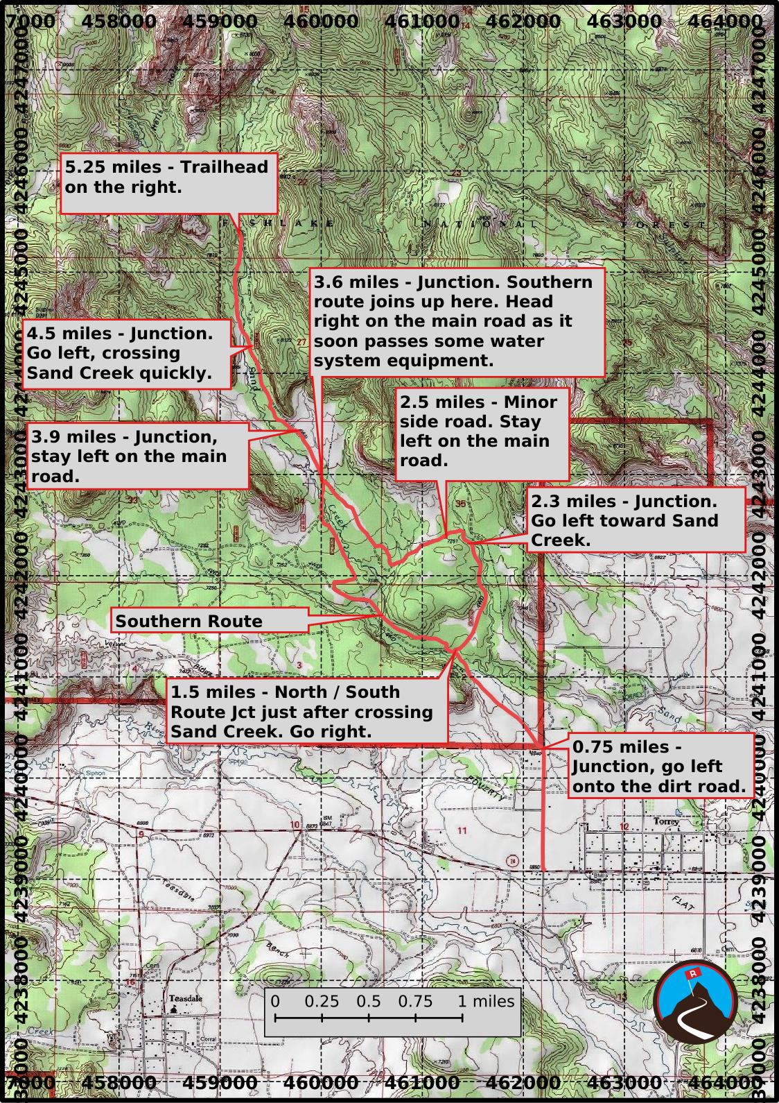 On the west side of the town of Torrey, turn north onto Sand Creek road. This is well signed. Reset your odometer as you turn onto Sand Creek Road off of highway 24. (The main road through Torrey)