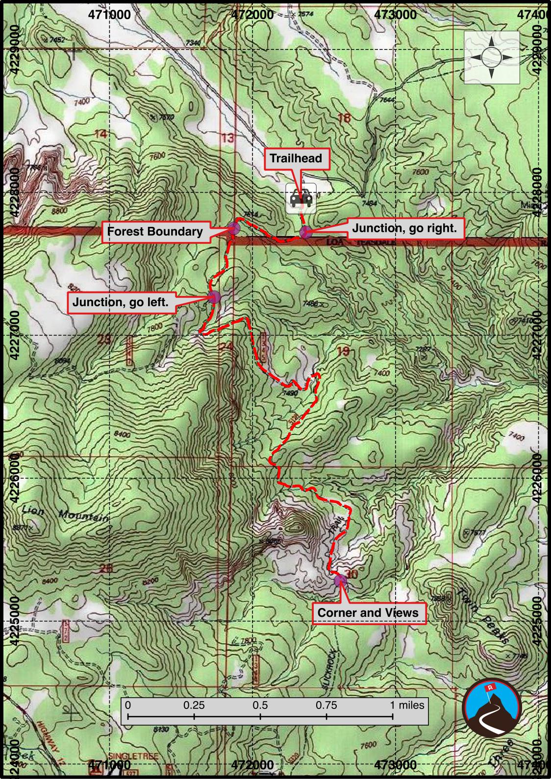 From the open parking area, follow the rough jeep/ATV trail south as it steeply climbs a very rocky hill. In 5 minutes is a signed trail junction. Go right here, as the trail flattens a little and becomes a bit less rocky.