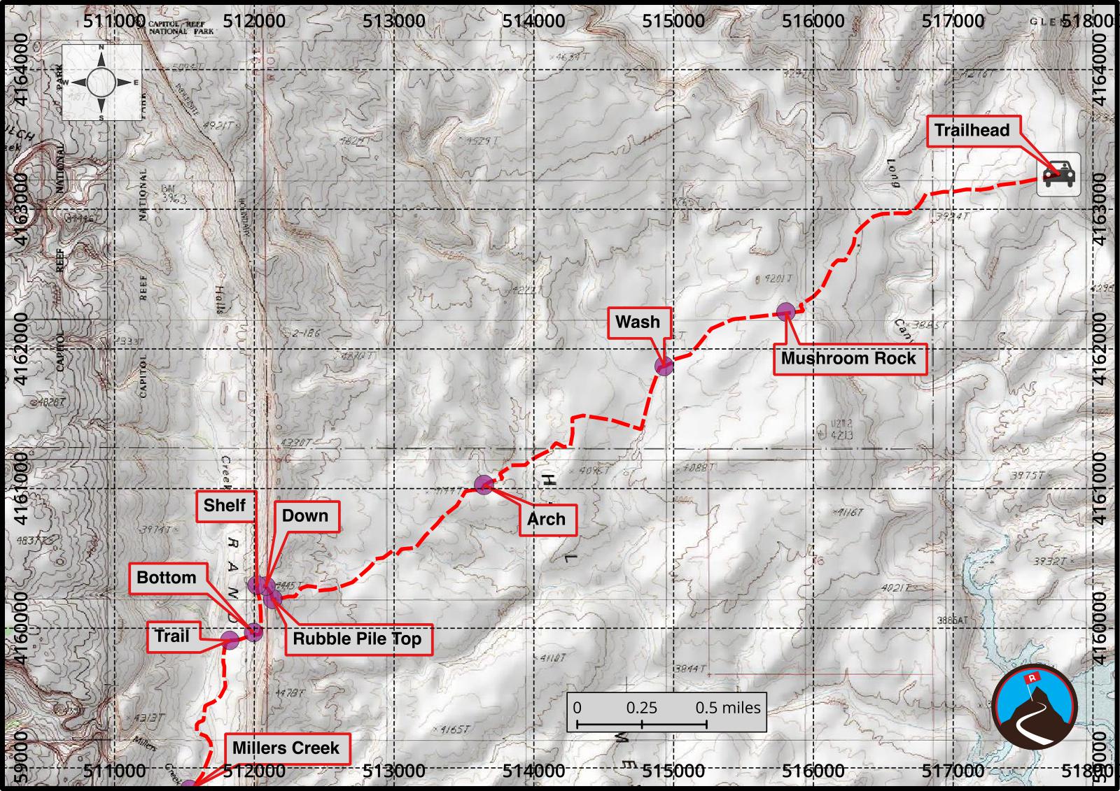 The route from the Burr Trail road is about 5 miles to Halls Creek. En route, there isn't much shade, and the terrain is difficult to navigate. GPS or excellent map and compass skills required to find the top of the Rubble Pile. Though only 5 miles, expect 3-5 hours for the approach/exit. In full heat of the summer, our group suffered mightily! Start early if it's hot!