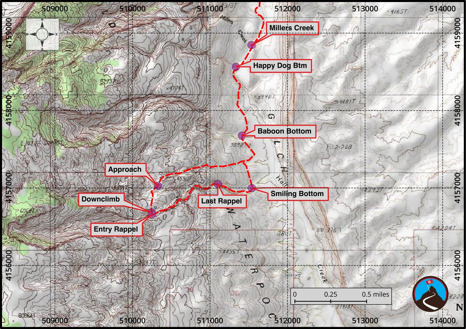 Once on the Halls Creek social trail, go left (south) to the first major slickrock dome just right of the trail. Leave the trail, skirt around the dome on the west side, and find an easy descent route into Halls Creek. Once in the creek, it is a short distance to Millers Creek coming in on the right.