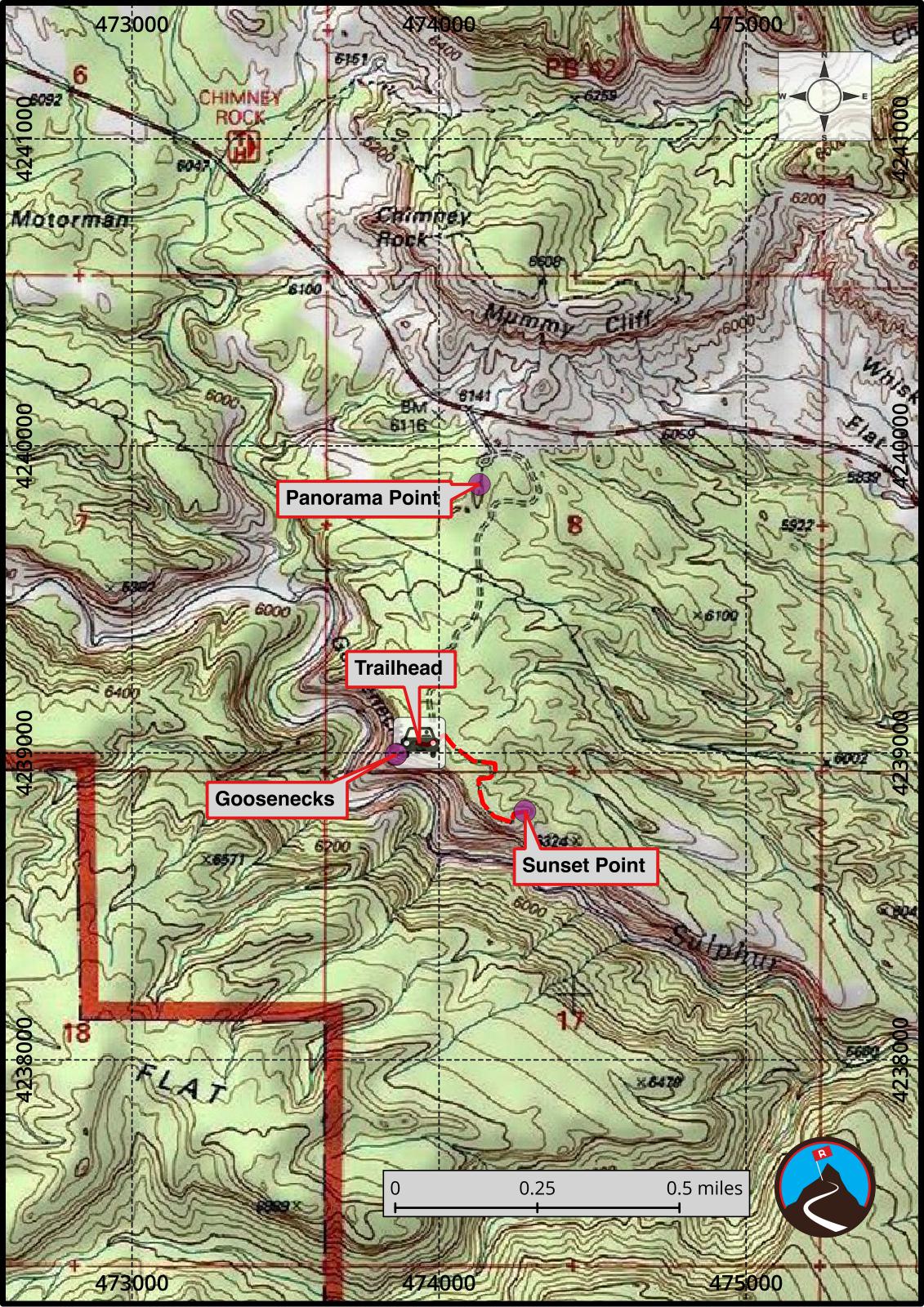 The short 0.3 miles ones way trail starts on the east side of the parking lot and meanders out to a bench mid-way, then continues to an excellent overlook at the end of the trail. Chimney Rock , Ferns Nipple , the Water Pocket Fold, Boulder Mountain, and even Mount Ellen the highest point in the Henry Mountains far of in the distance to the east are visible. Not surprisingly, best lighting is generally around sunset. Bring warm clothes and a flashlight!