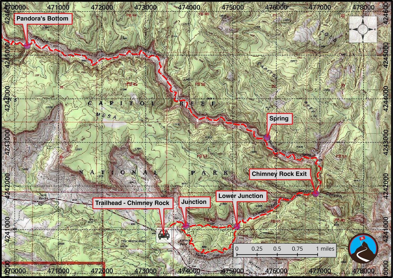 From the spring, it is 1.6 miles (30-45 minutes) down to where Chimney Rock Canyon comes in on the left. This junction seems pretty obvious, but at least one group has walked by it.
