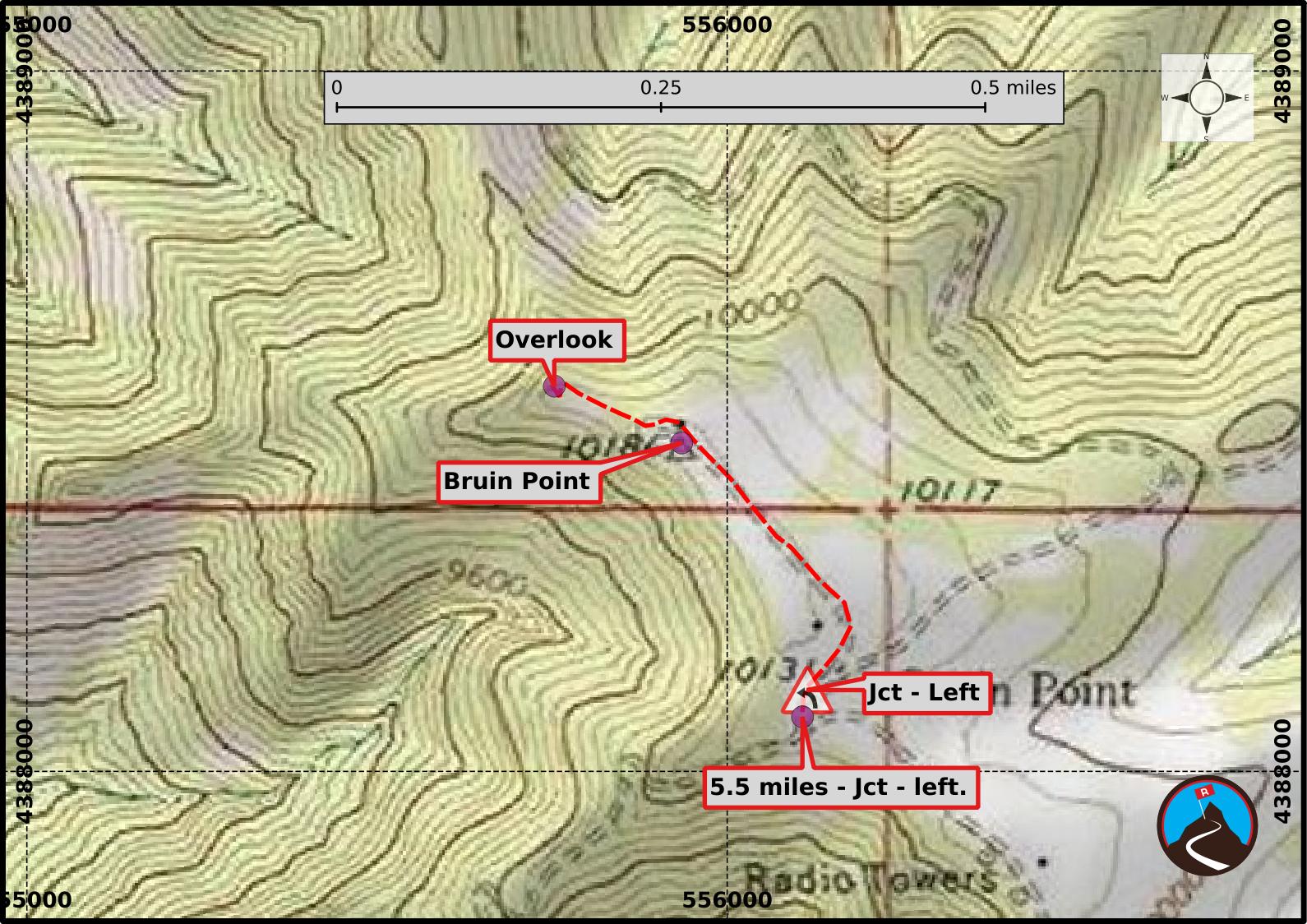 - About 3.6 miles from Sunnyside is a major junction signed for Bruin Point. Turn right onto this dirt road. Reset your odometer. ( 12S 553376E 4383569N / 39°36'01"N 110°22'42"W )