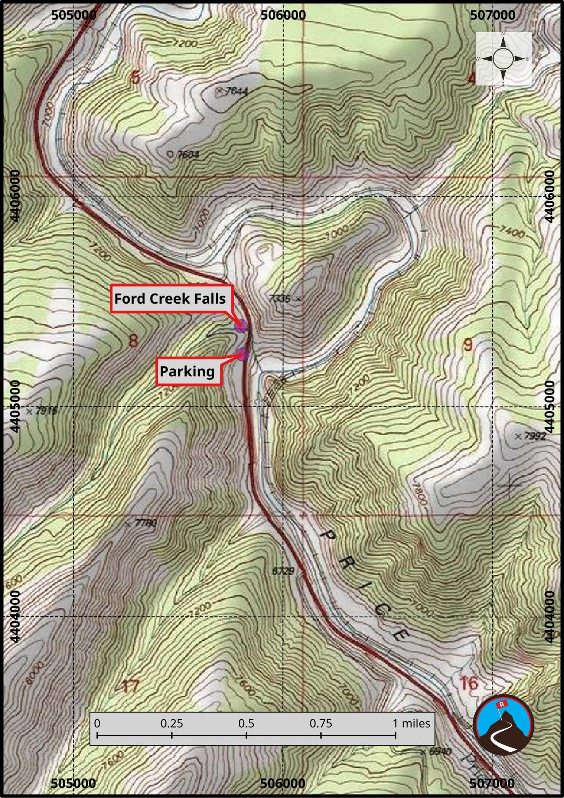 The falls are at about mile marker 223.6 on US-6, with the preferred parking area being at about mile marker 223.7. This is about 16 miles north of Price when heading towards Spanish Fork.