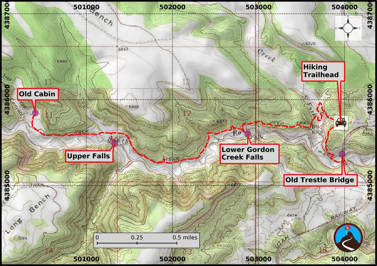 From the trailhead, follow the rough dirt road west. It is flat for a short distance, then makes a very steep descent into the North Fork of Gordon Creek. This section is not rocky, but very steep.
