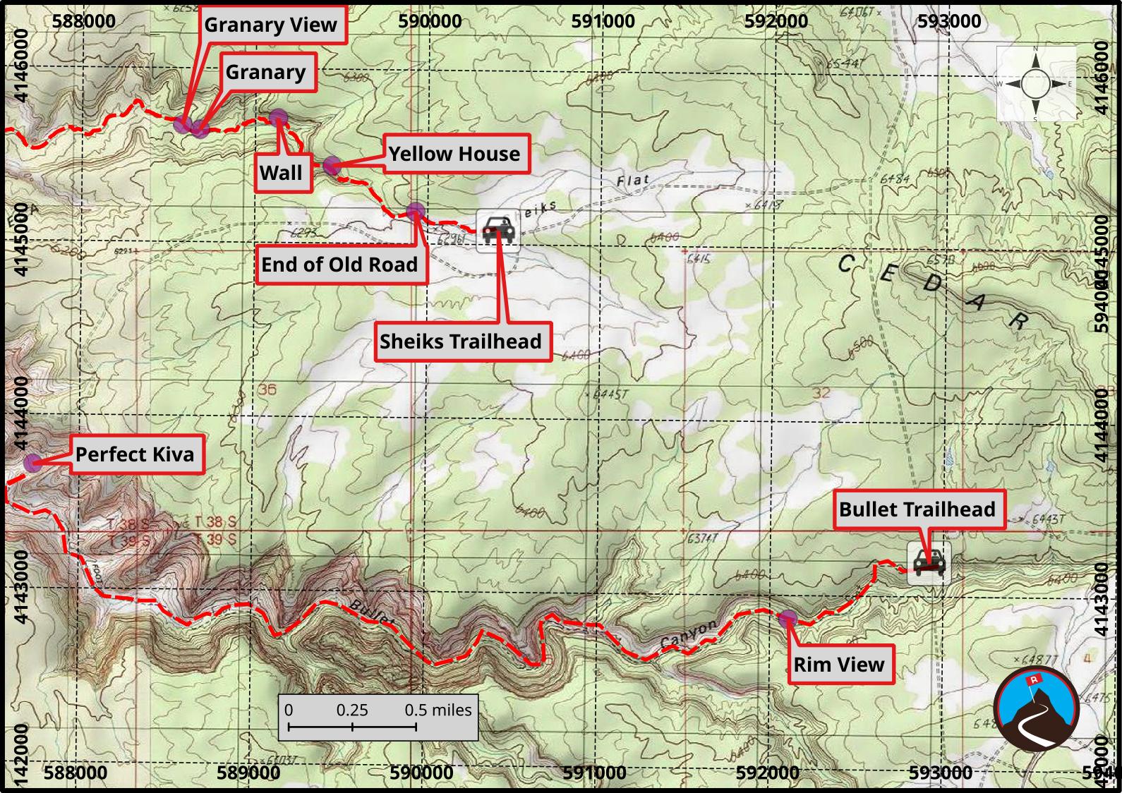 - To get to the Bullet trailhead, go back from the Sheiks Canyon trailhead 1.7 miles to the county road 250/251 junction and go right on 251 for 1.4 miles to the Bullet Canyon trailhead. ( 12S 592937E 4143182N / 37°25'51"N 109°56'58"W )