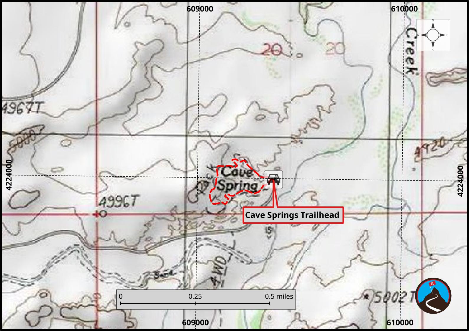 - Continue 1.05 miles to the end of the road and The Cave Spring Trailhead parking lot.