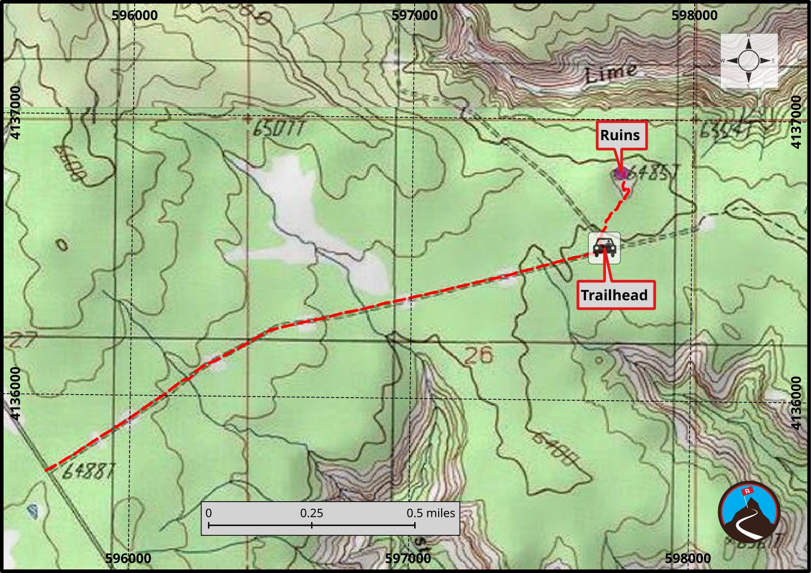 The side road requires high clearance but is not too bad. There are a few small, primitive campsites and side roads along the way. Stay on the main dirt road as it heads east. Follow the dirt road for about 1.4 miles to a major junction. The junction is the trailhead, with the butte just to the north and a touch east from the trailhead.