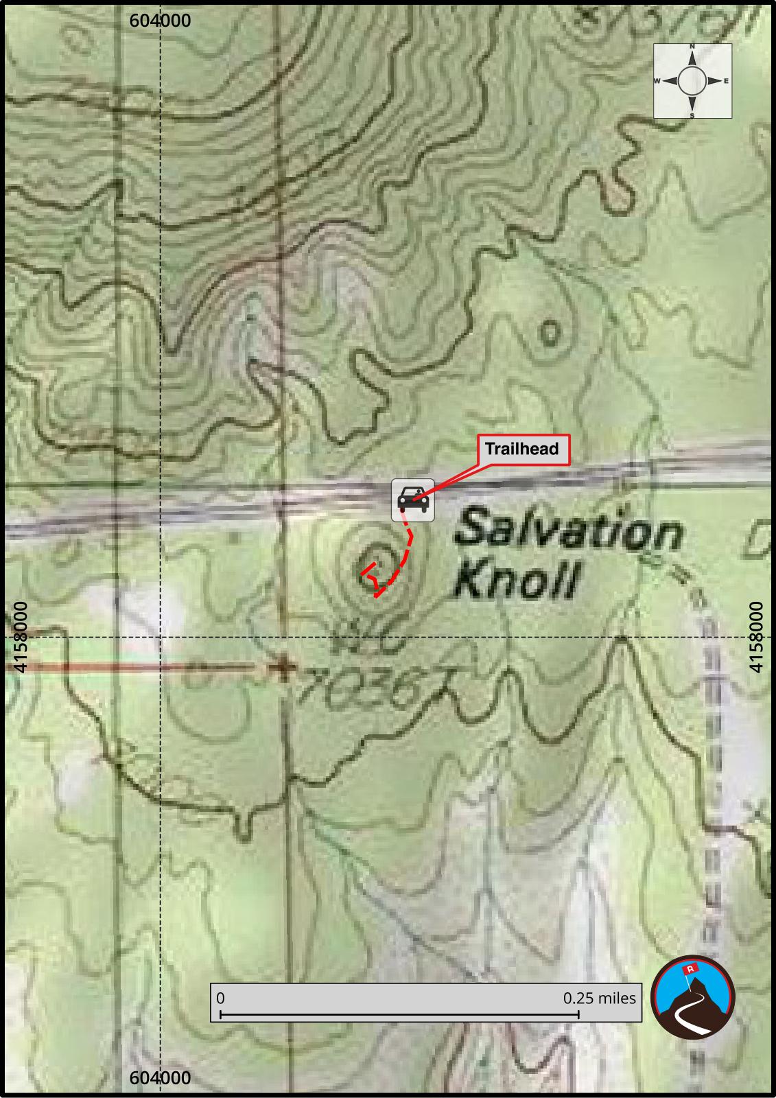 The trailhead is at milepost 97 on highway 95. This is 97 miles south of Hanksville, or 28 miles from Blanding. If coming from Blanding, go south out of town a few miles to the gunction with highway 95. Go west on 95 about 24.5 miles to the large pullout and Salvation Knoll on the south side of the highway.