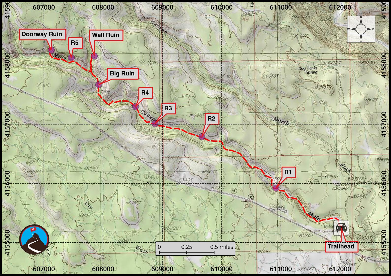 About 3 miles from the trailhead, a pool and small dryfall force the trail up and out of the canyon floor on the south side. Follow the trail around the dryfall, and look for a big ruin a few minutes up the canyon on the right. It is well hidden by large trees, but a good landmark and very good ruin.