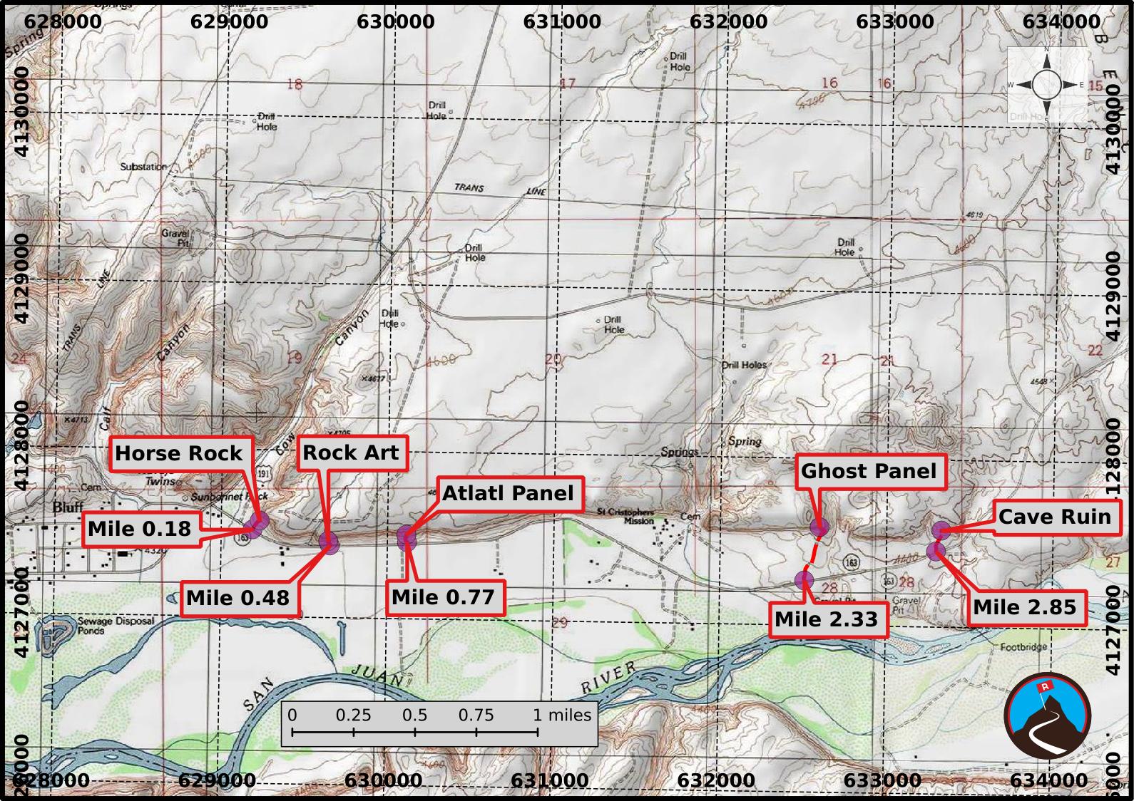 From the junction of US-191 and UT-162 on the north end of Bluff, reset your odometer and head east on UT-162. Sites are described below in approximate mileages from this junction, and all sites are on the left (north) side of the road.