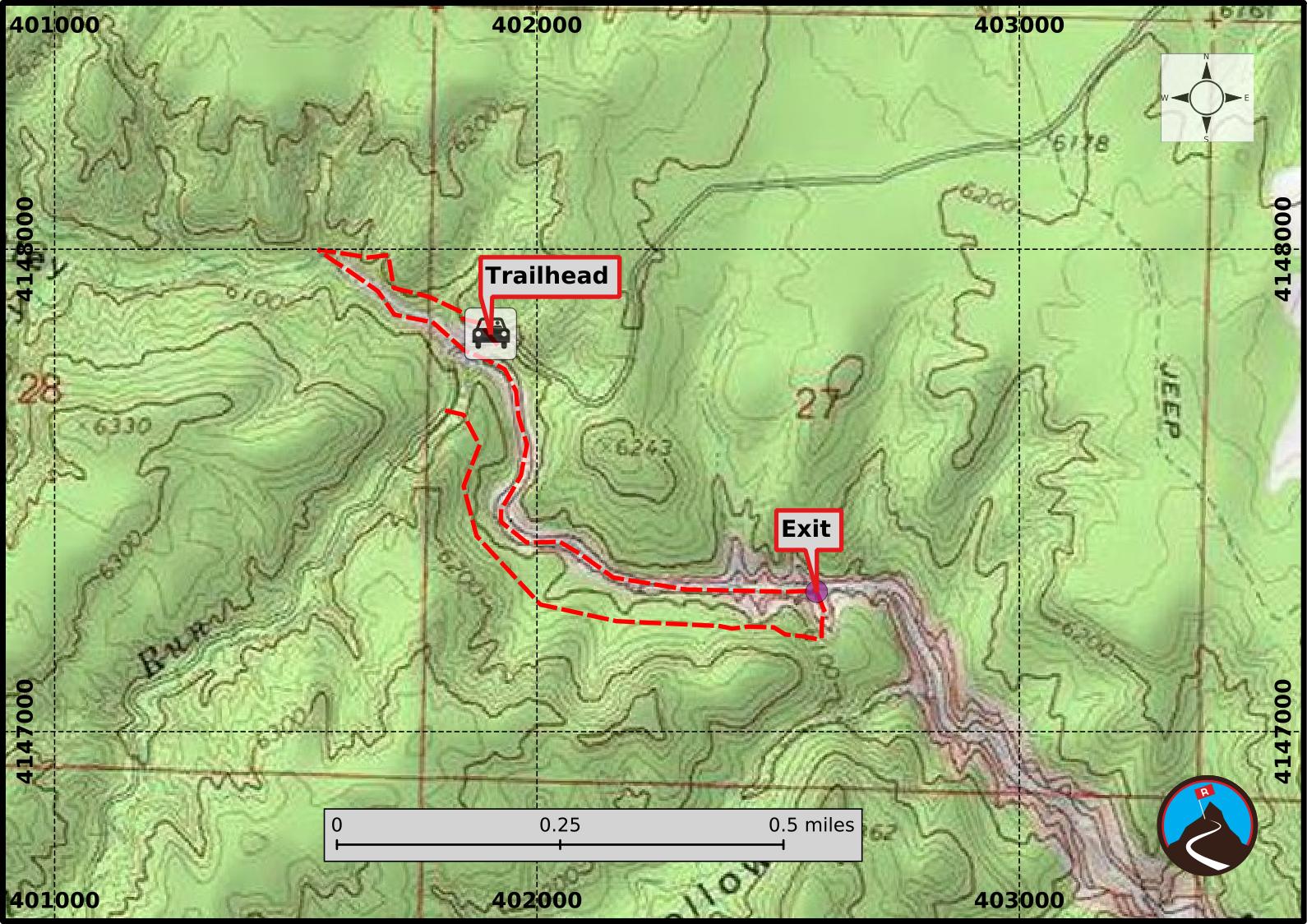 The trailhead is right on the edge of Bull Valley Gorge, and gives impressive views of the canyon. From the car park, walk on the well-defined trail up the canyon on the north side. There is a trail register within 100M of the trailhead. Follow the trail for 10 or 15 minutes until the canyon becomes shallow and easy to descend to the bottom.