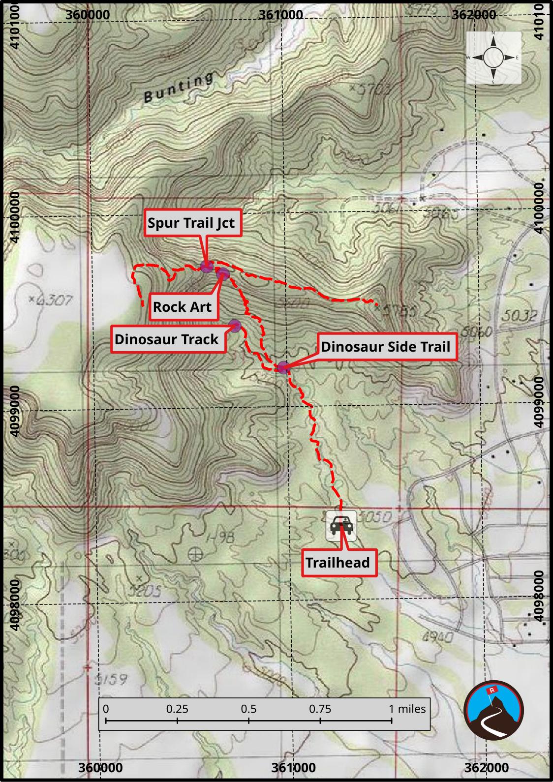From the Dinosaur Track side trail junction, continue up the main Bunting Trail. The trail steepens from here on out! A few switchbacks make the hike seem more manageable. There are many great spots to stop and catch your breath.. err... take in the views. As the trail nears the top, it comes close to a small cliff base. Look for rock art here. It would be easy to miss, except the BLM has a small sign here about site etiquette.