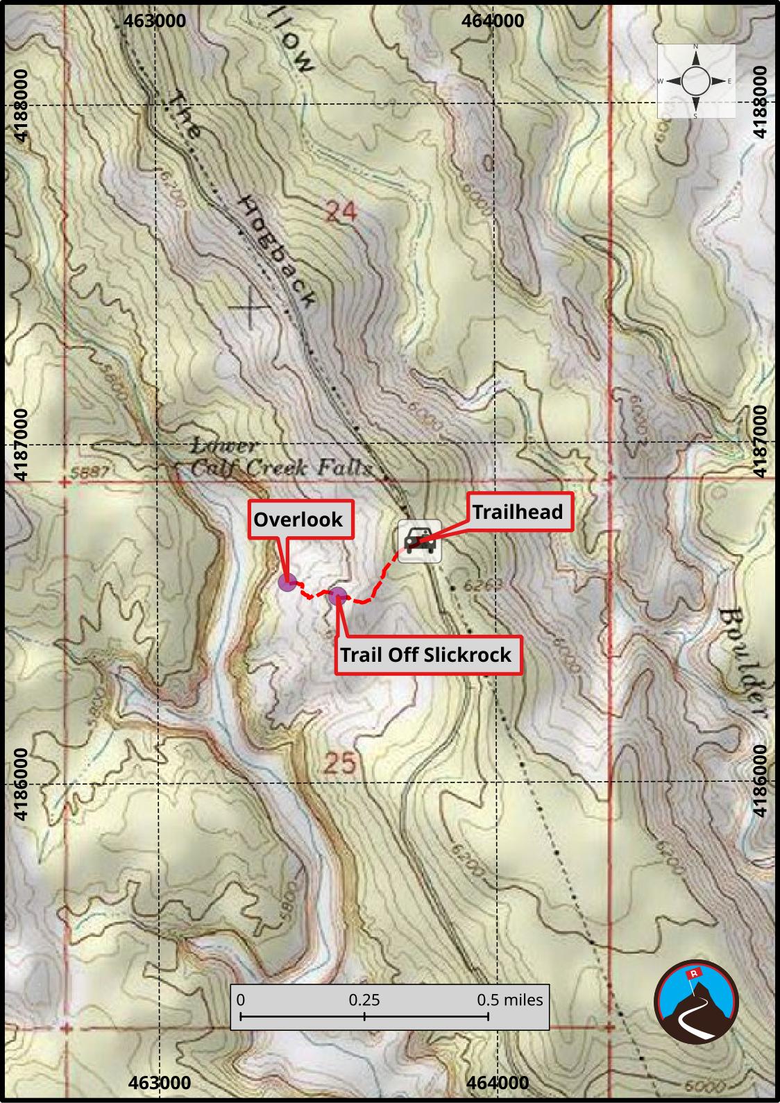 Once on the slickrock, head south and west. You can see Calf Creek to the west and a social trail at the bottom of the slickrock on the west in the dirt that heads toward Calf Creek.